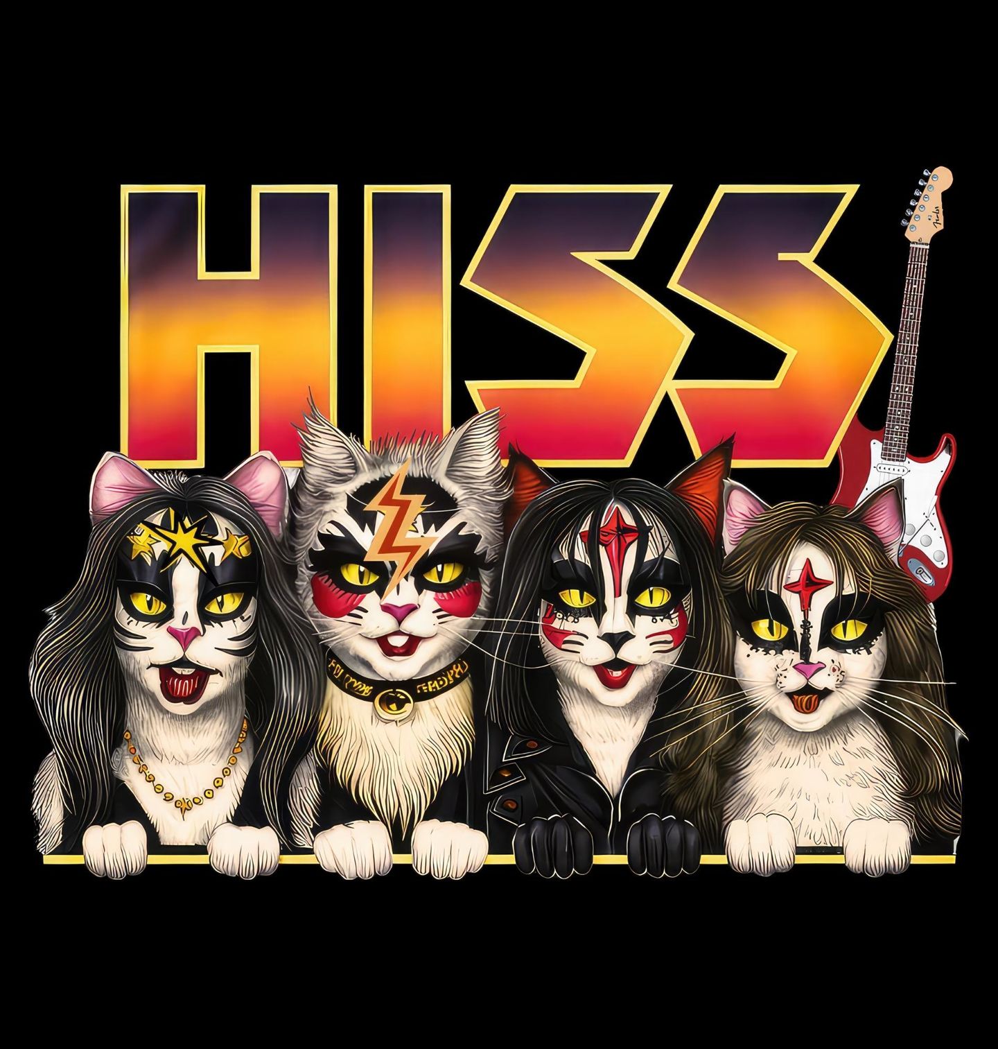 Dámské tričko Kočičí Rock HISS. Tento originální motiv spojuje nezaměnitelný make-up a ikonický styl slavných rockerů se zábavnými kočičími tvářemi. Perfektní volba pro všechny fanoušky kapely KISS, rockové hudby, koček a humoru. Tento motiv je ideální pro všechny milovníky tvrdé hudby, rockové estetiky a originálních ilustrací.