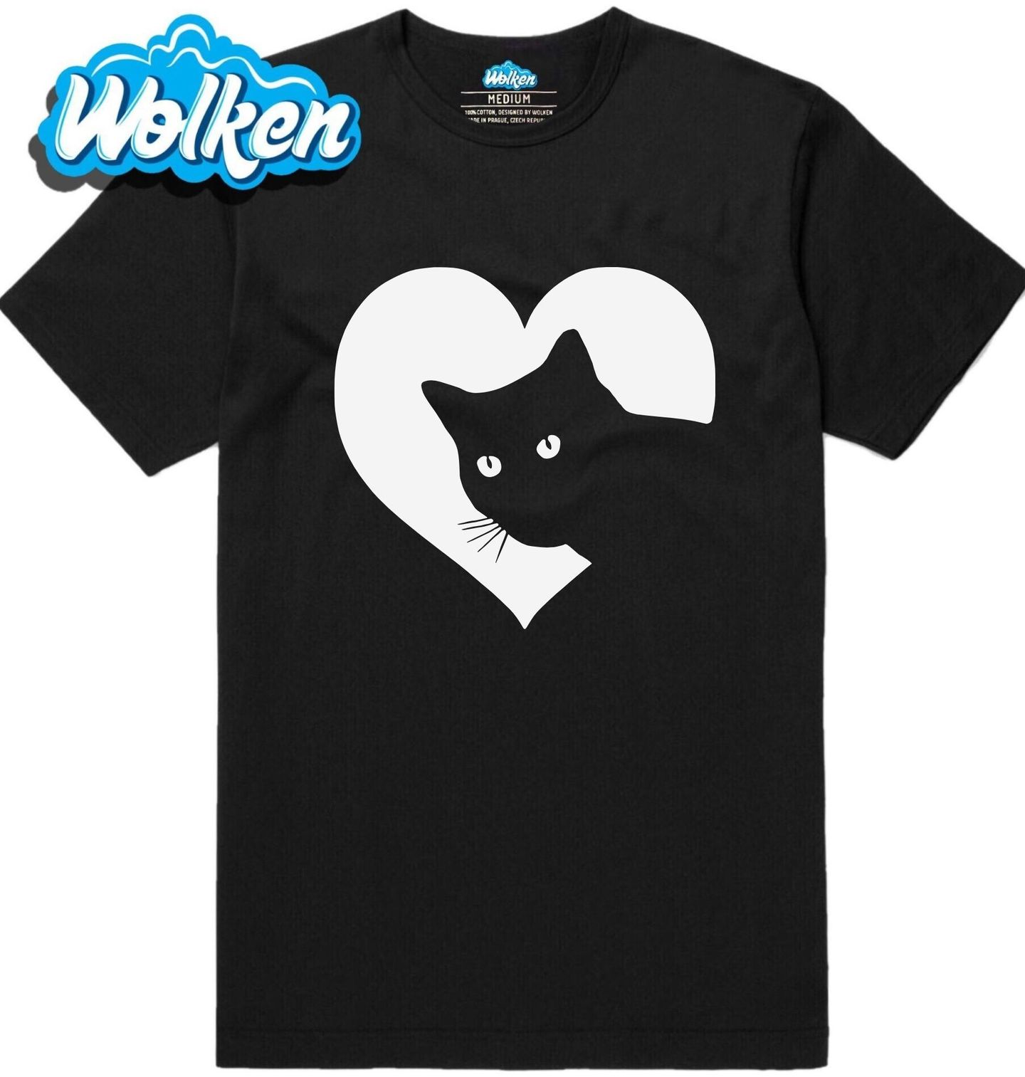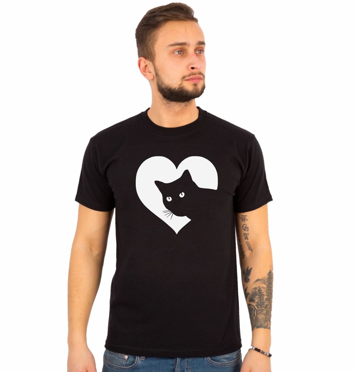 Pánské tričko Kočičí Stín v Srdci. Stylová silueta, kde se černá kočka noří ze stínu ve tvaru velkého srdce, vyjadřuje lásku ke kočkám s nádechem tajemství a elegance. Tento motiv spojuje jednoduchost s hlubokým významem – kočka, která se ukrývá i přitahuje. Ideální pro milovníky koček, minimalismu a černobílé estetiky.