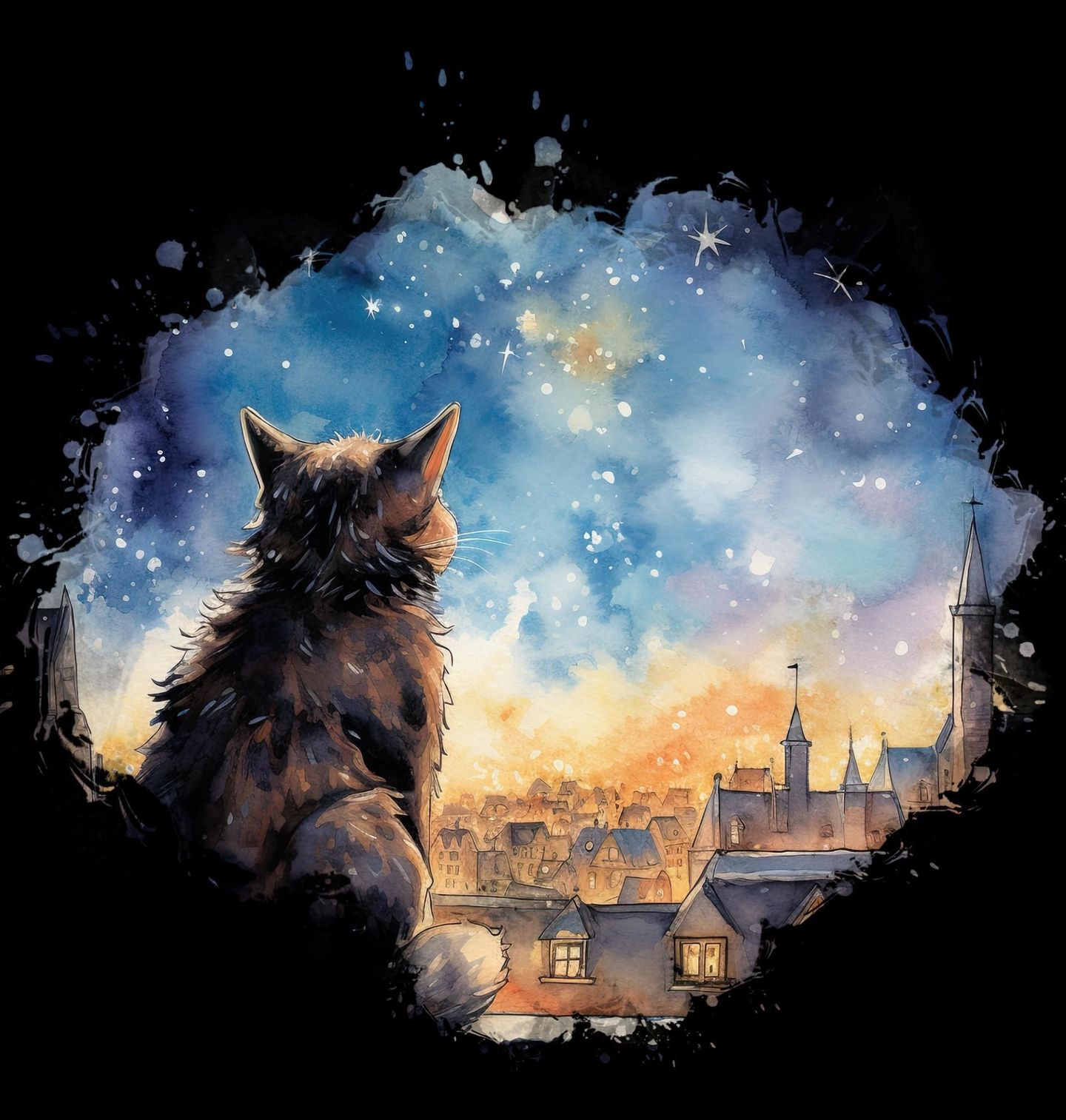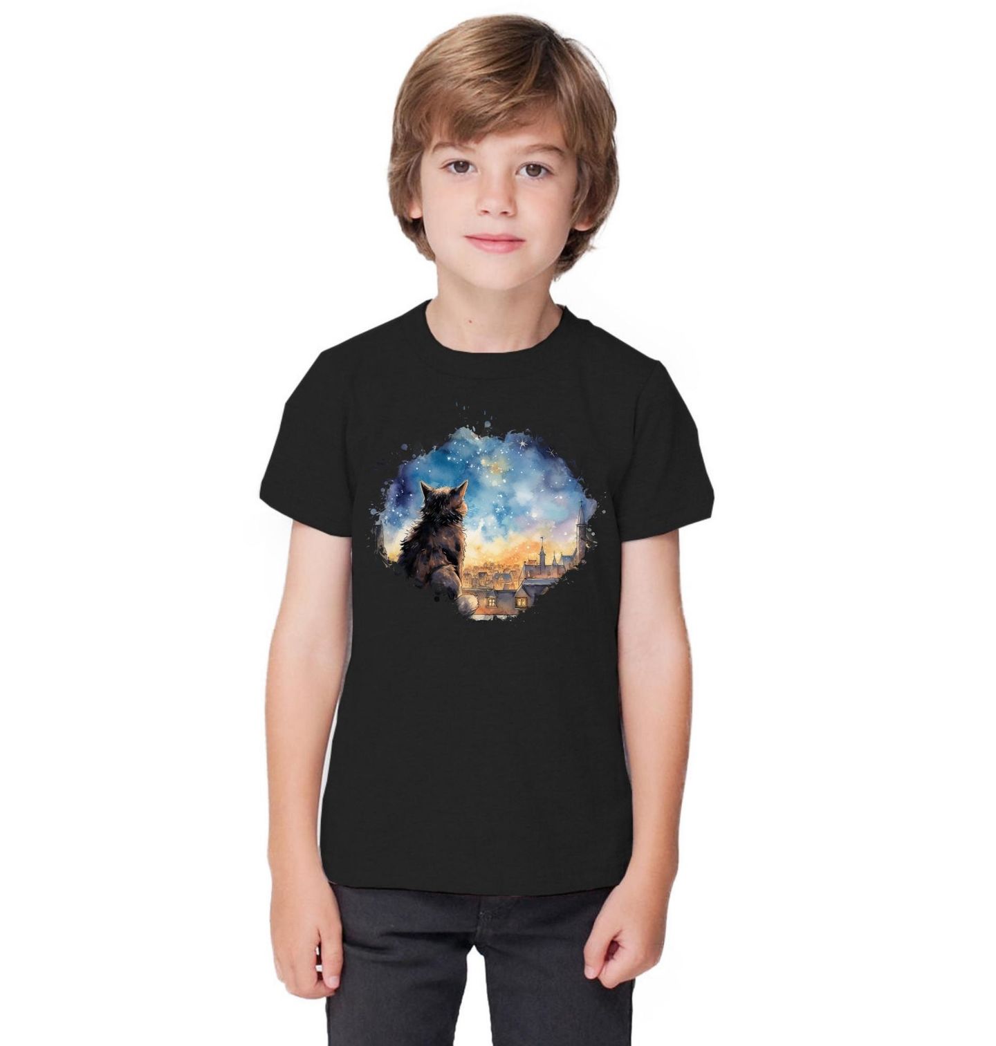 Dětské tričko Kočičí Strážkyně Města. Magický akvarelový motiv zachycuje kočku, která sedí na střeše a tiše pozoruje spící město pod sebou. Nad její hlavou se rozprostírá noční obloha plná hvězdy, které vytvářejí snovou a klidnou atmosféru. Okamžik působí jako tiché zamyšlení nad světem, kdy čas zpomaluje a noc vypráví své příběhy.