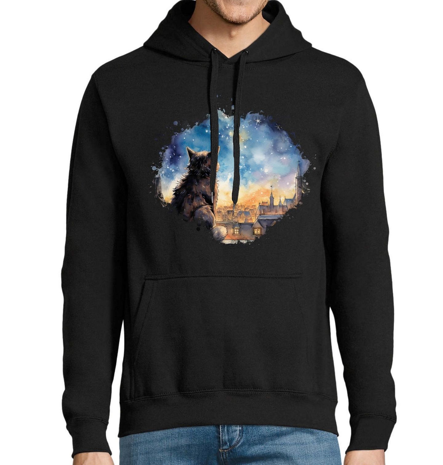 Pánská mikina Kočičí Strážkyně Města. Magický akvarelový motiv zachycuje kočku, která sedí na střeše a tiše pozoruje spící město pod sebou. Nad její hlavou se rozprostírá noční obloha plná hvězdy, které vytvářejí snovou a klidnou atmosféru. Okamžik působí jako tiché zamyšlení nad světem, kdy čas zpomaluje a noc vypráví své příběhy.