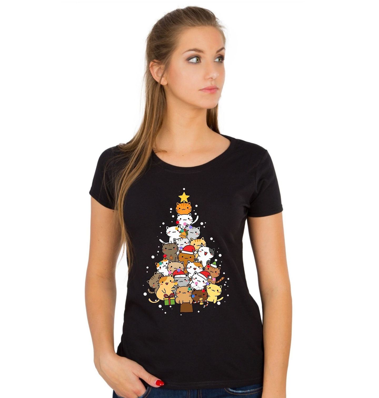 Dámské tričko Kočičí Stromeček. Veselý a barevný motiv, kde každá kočka tvoří součást roztomilého vánočního stromečku. Tato sváteční pyramida z koček doplněná o dárečky, čepičky a ozdoby přináší úsměv i pohodu. Spojuje hravost, roztomilost a Vánoce v jednom obrázku, který potěší každého milovníka koček a sváteční atmosféry.