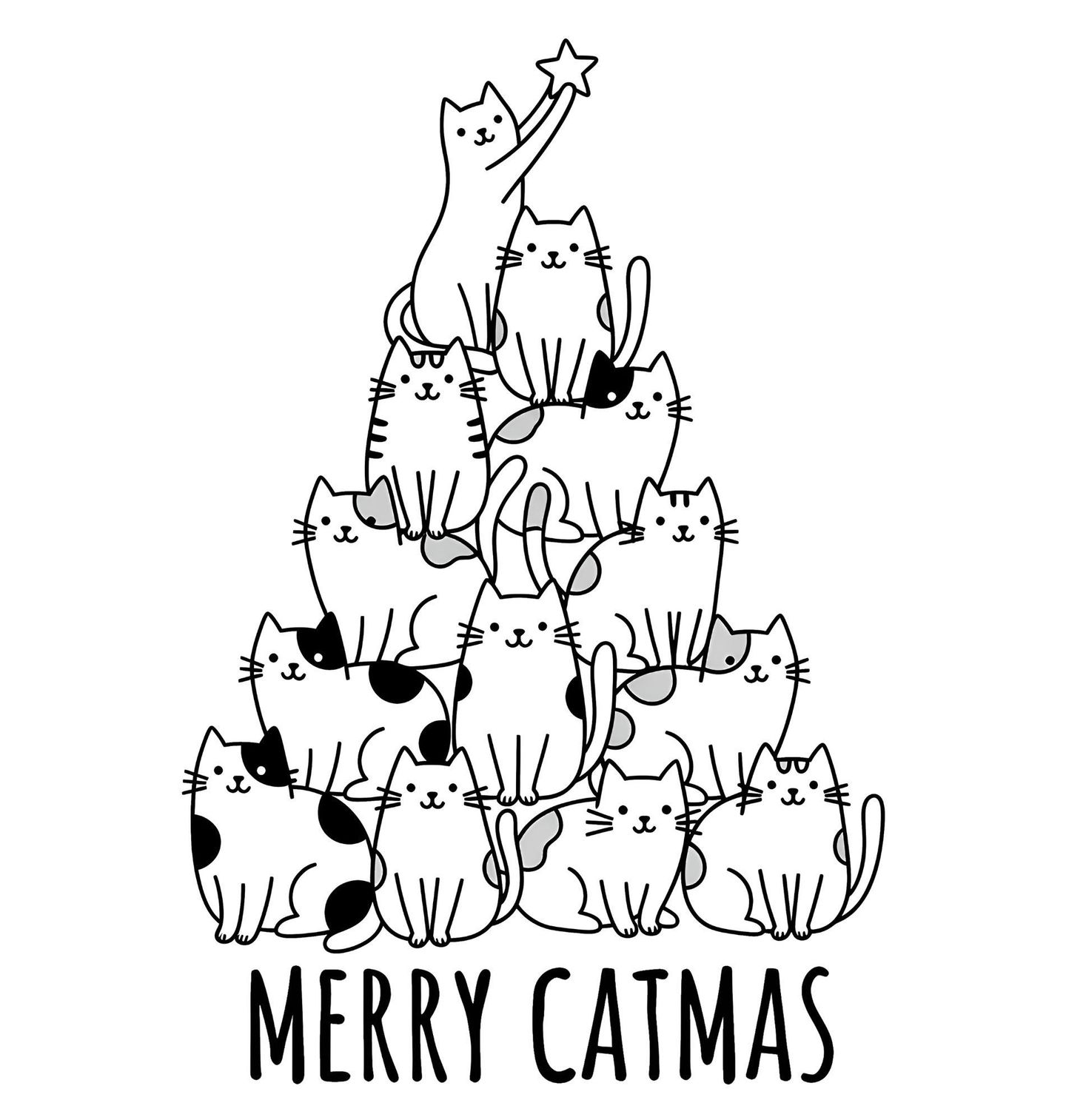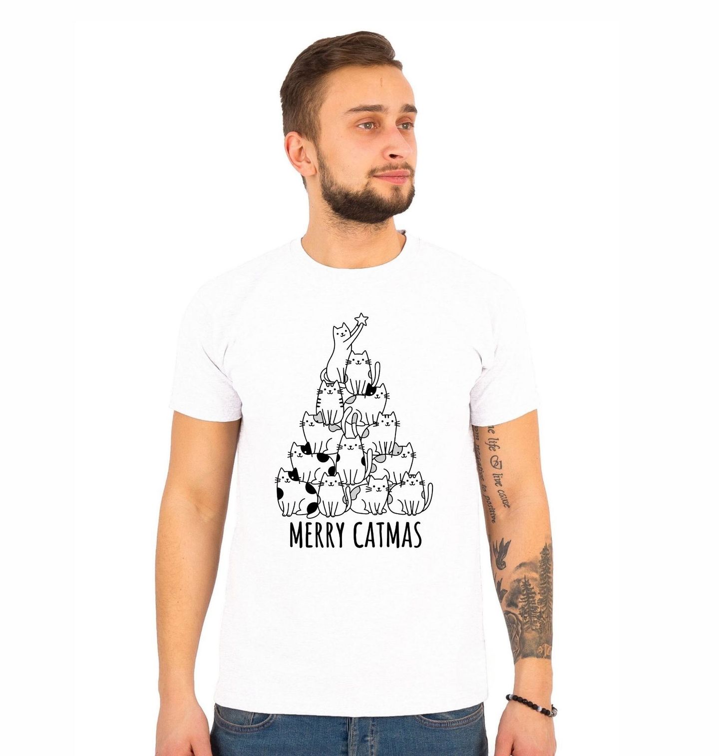 Pánské tričko Kočičí Stromeček Merry Catmas. Tento motiv s pyramidou spokojených koček tvořících vánoční stromeček je ideálním způsobem, jak ukázat svou lásku ke kočkám i sváteční náladu. Jedna kočka dokonce hrdě umísťuje hvězdu na vrchol – Vánoce můžou oficiálně začít!