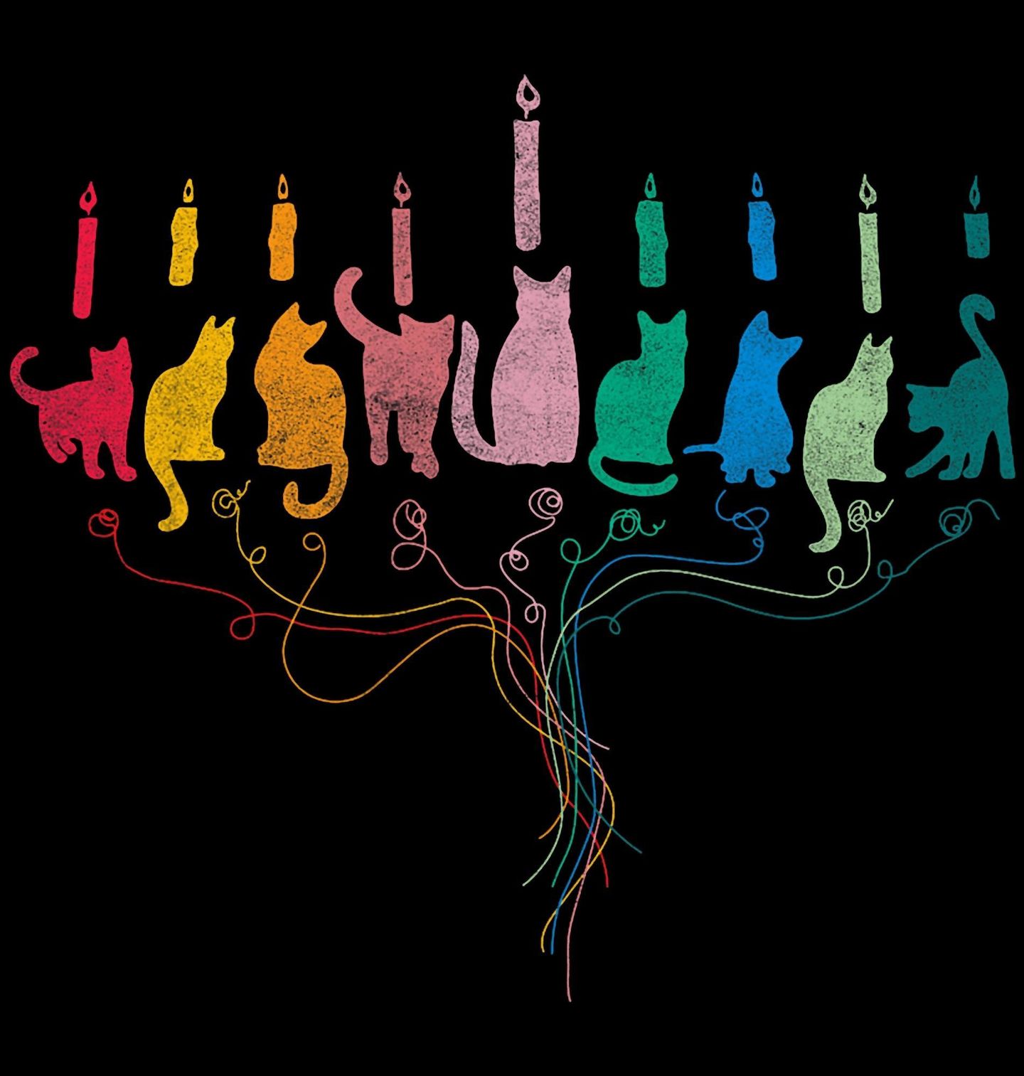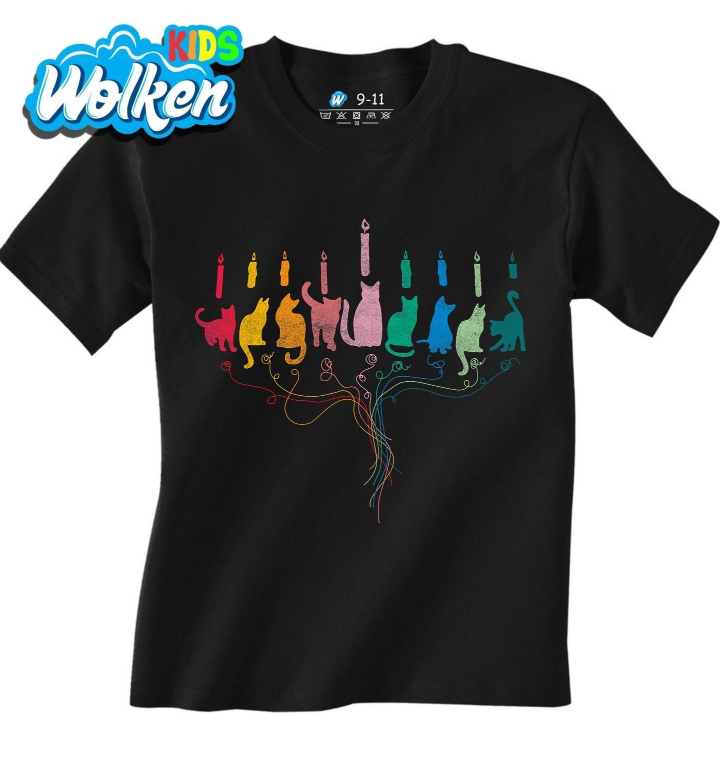 Dětské tričko Kočičí Svícen Menora. Originální motiv spojuje Vánoce a židovský svátek Chanuka v kočičím stylu. Siluety barevných koček vytvářejí tvar chanukového svícnu – menory – se zapálenými svíčkami. Menora, někdy též menóra, je sedmiramenný svícen a tradiční symbol judaismu. Vánoce a Chanuka s kočkami potěší každého, kdo hledá netradiční spojení svátků a kočičí radosti.