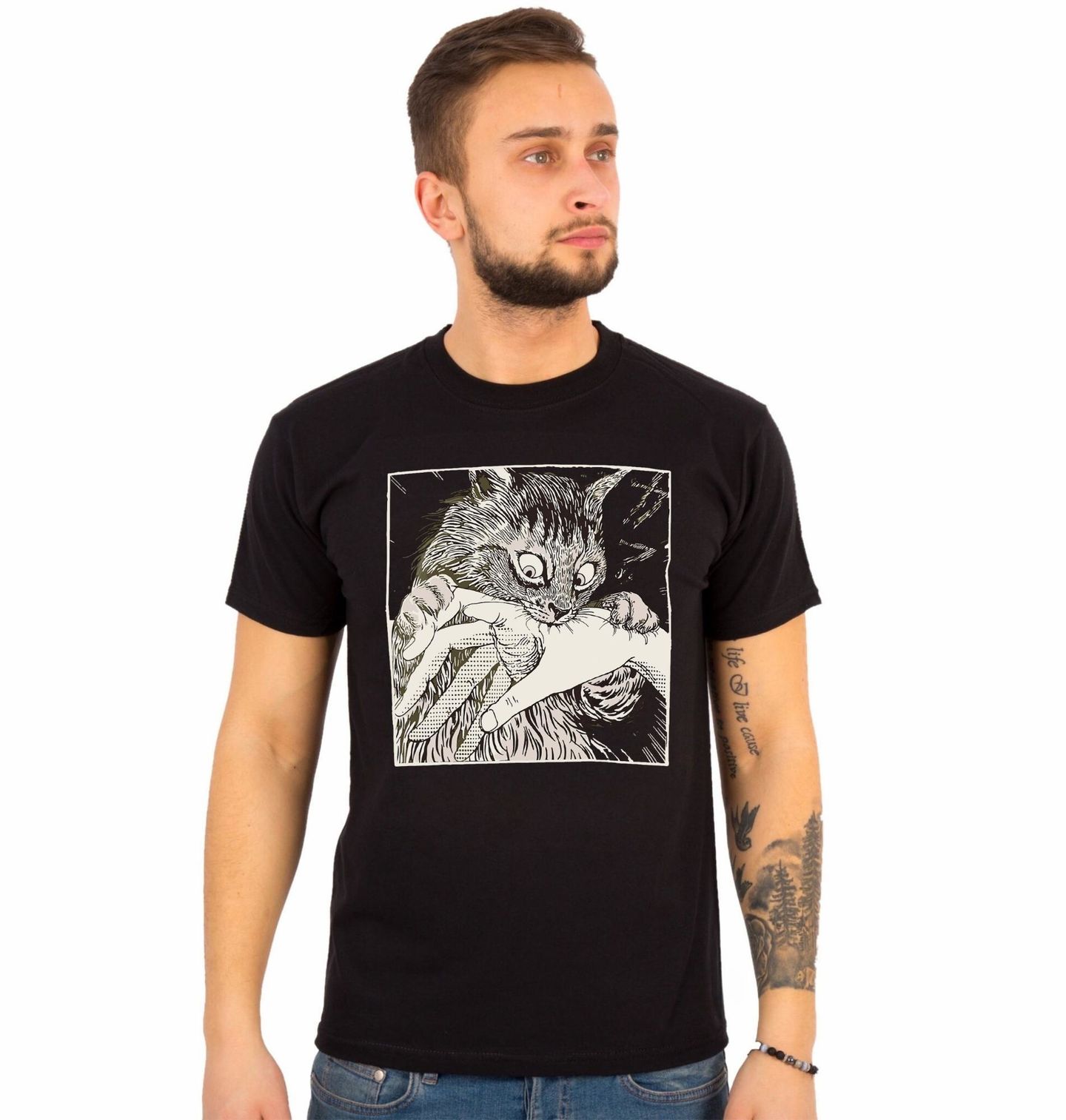 Pánské tričko Kočičí Útok. Vtipný a originální motiv zachycující typickou situaci, kterou zná každý majitel – roztomilá kočka, která se během vteřiny promění v malého predátora. Detailní ilustrace ukazuje moment, kdy kočka chytne ruku a rozhodne se, že mazlení už stačilo. Tento motiv perfektně vystihuje hravou, ale zároveň nevyzpytatelnou povahu koček.