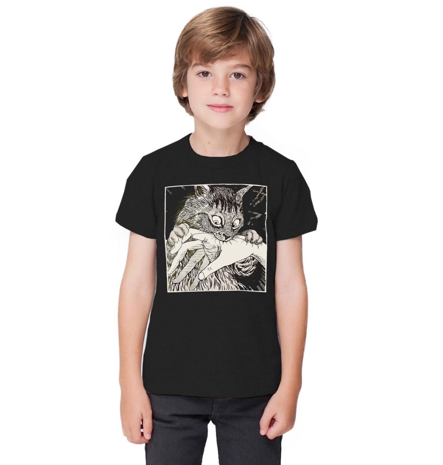 Dětské tričko Kočičí Útok. Vtipný a originální motiv zachycující typickou situaci, kterou zná každý majitel – roztomilá kočka, která se během vteřiny promění v malého predátora. Detailní ilustrace ukazuje moment, kdy kočka chytne ruku a rozhodne se, že mazlení už stačilo. Tento motiv perfektně vystihuje hravou, ale zároveň nevyzpytatelnou povahu koček.