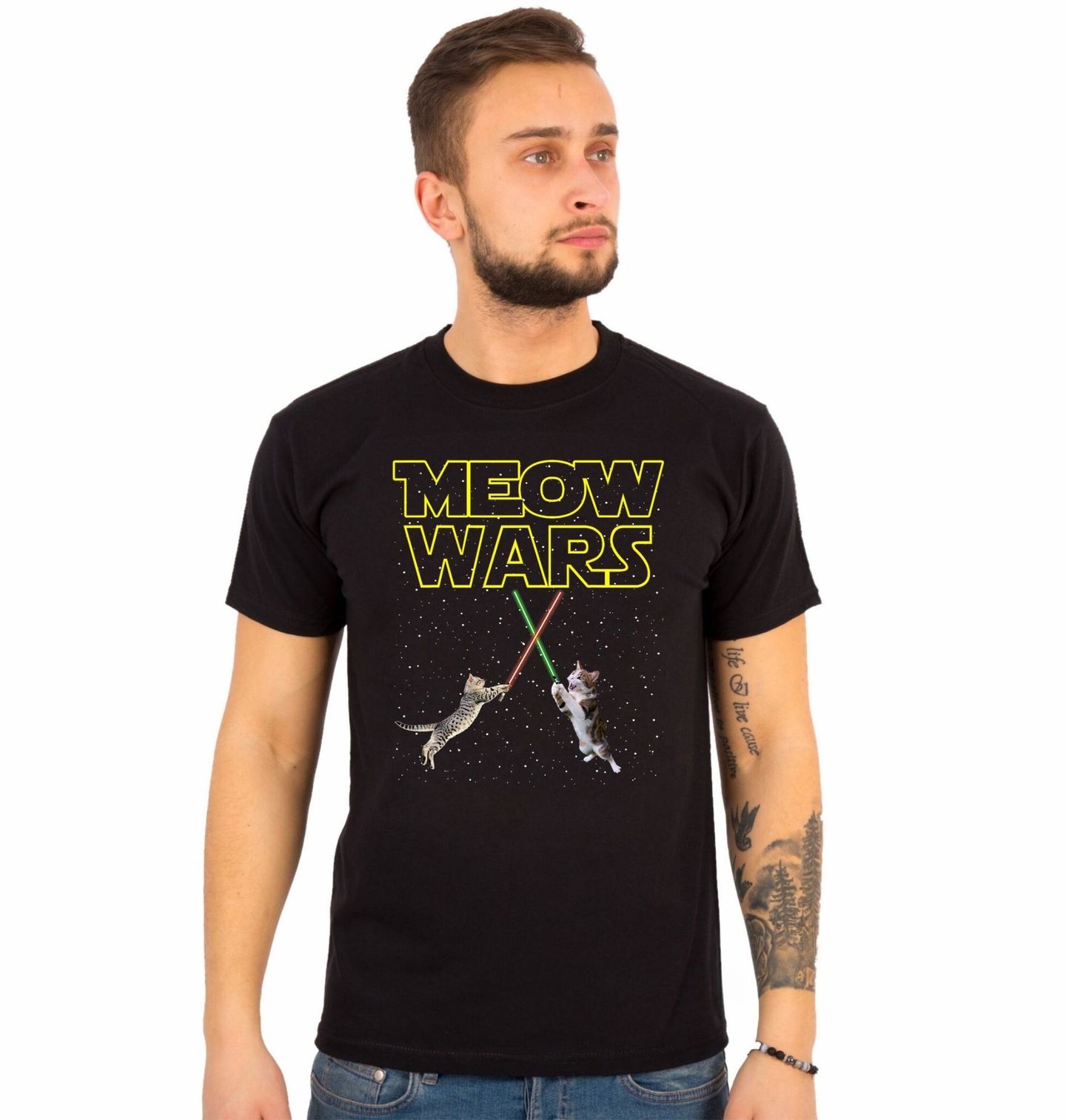 Pánské tričko Kočičí Války Meow Wars. Parodie obsahuje text „MEOW WARS“ (slovní hříčka na Star Wars Hvězdné války) a zobrazuje kočky bojující se světelnými meči. Perfektní kombinace sci-fi a humoru pro fanoušky filmů i koček.