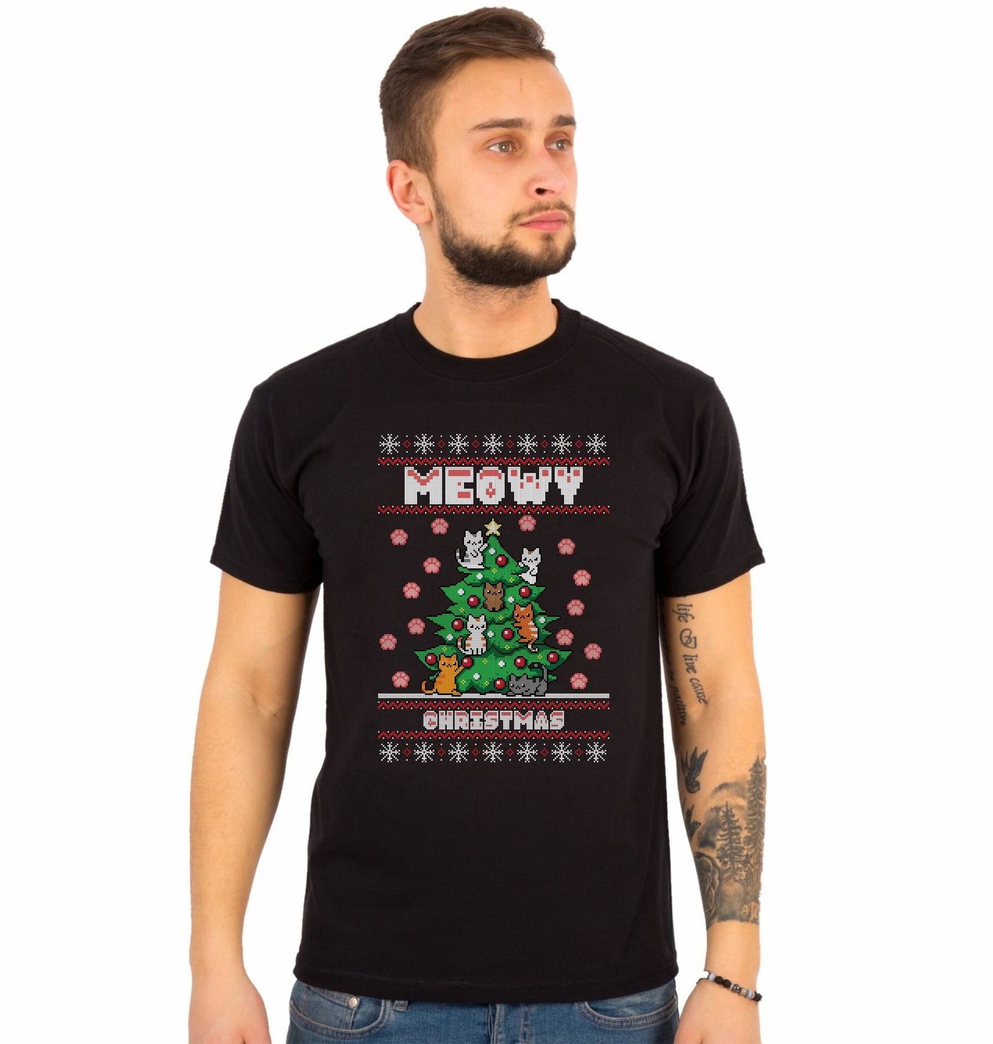 Pánské tričko Kočičí Vánoce Meowy Christmas. Užij si Vánoce s humorem a stylem! Tento sváteční motiv v duchu ugly sweater stylu přináší vše, co potřebuješ – kočka, Vánoce, stromeček a porci roztomilosti. Ideální pro každého milovníka koček, který se nebojí ukázat svůj smysl pro humor.