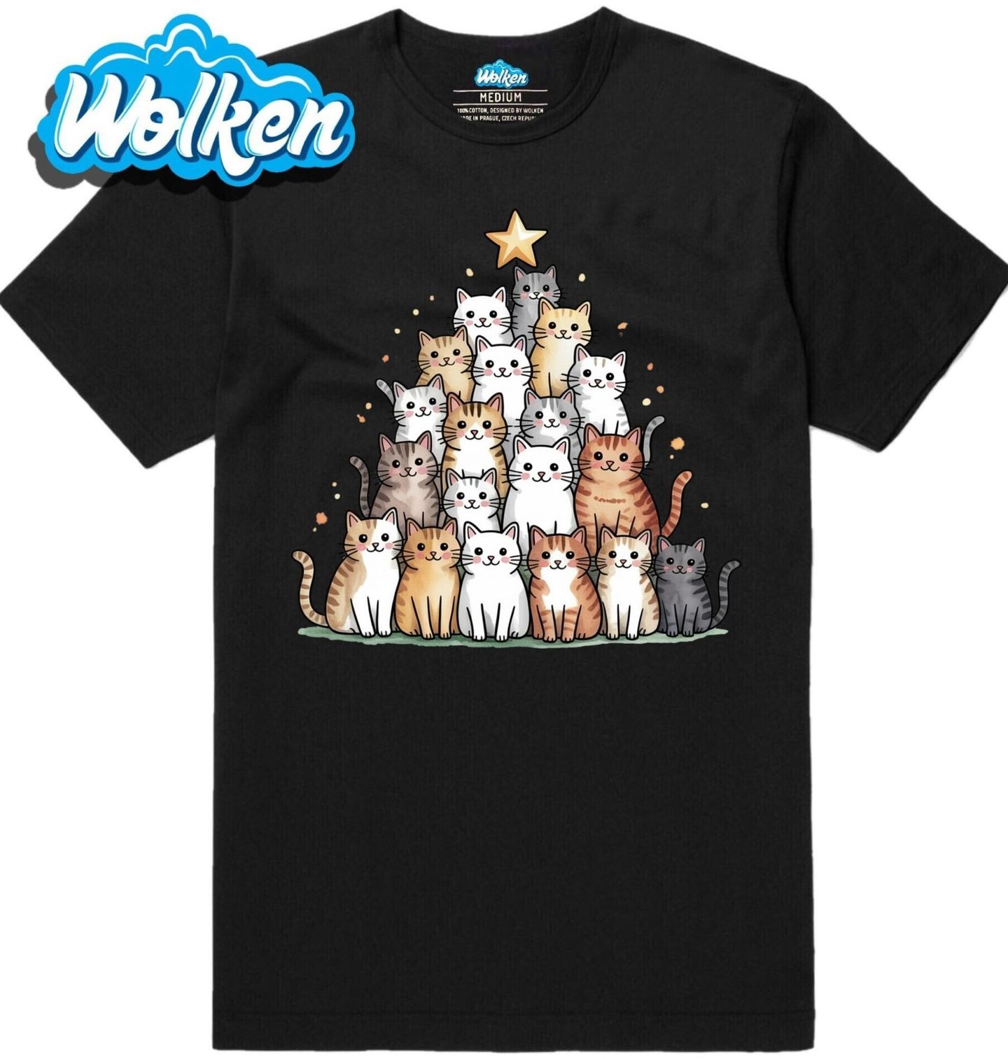 Pánské tričko Kočičí Vánoční Stromeček. Roztomilá kočka klidně odpočívající uprostřed jemných květin vyzařuje pohodu a něhu. Tento motiv spojuje krásu přírody a lásku ke zvířatům – kočka a květiny vytvářejí harmonickou scénu, která pohladí po duši každého milovníka roztomilosti, klidu a estetiky.