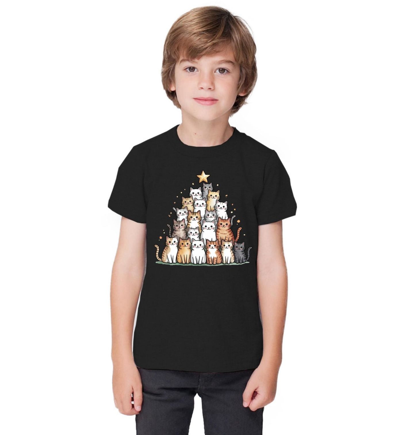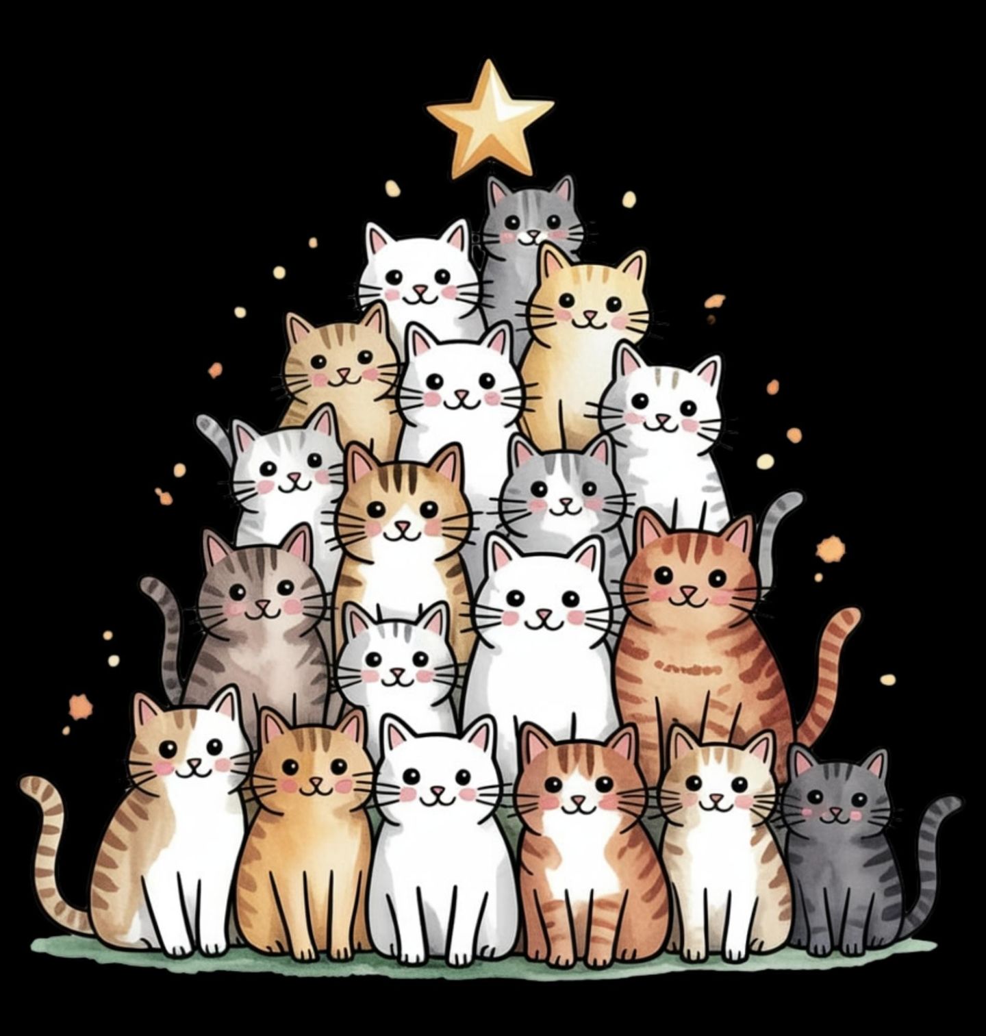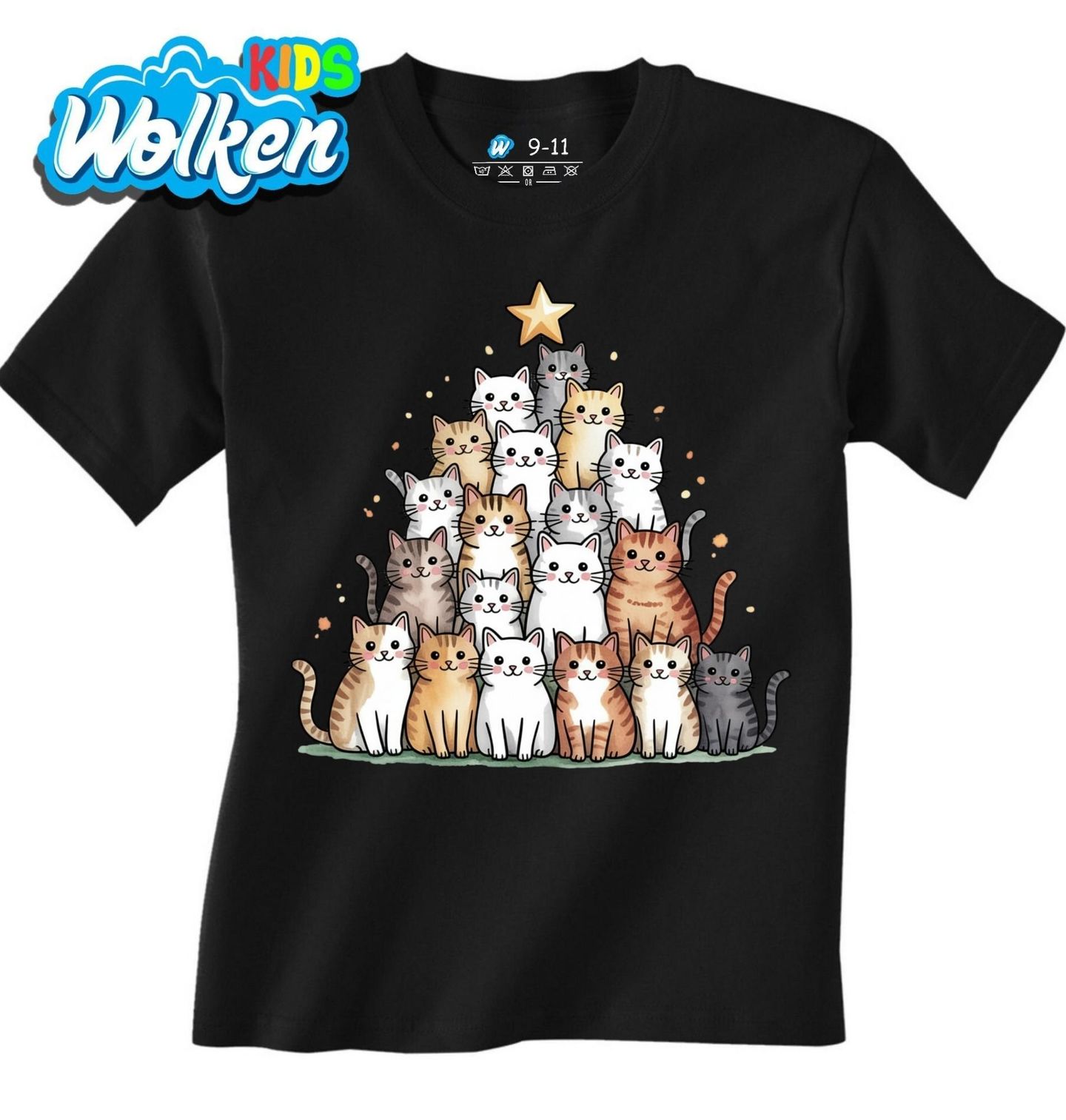 Dětské tričko Kočičí Vánoční Stromeček. Roztomilá kočka klidně odpočívající uprostřed jemných květin vyzařuje pohodu a něhu. Tento motiv spojuje krásu přírody a lásku ke zvířatům – kočka a květiny vytvářejí harmonickou scénu, která pohladí po duši každého milovníka roztomilosti, klidu a estetiky.