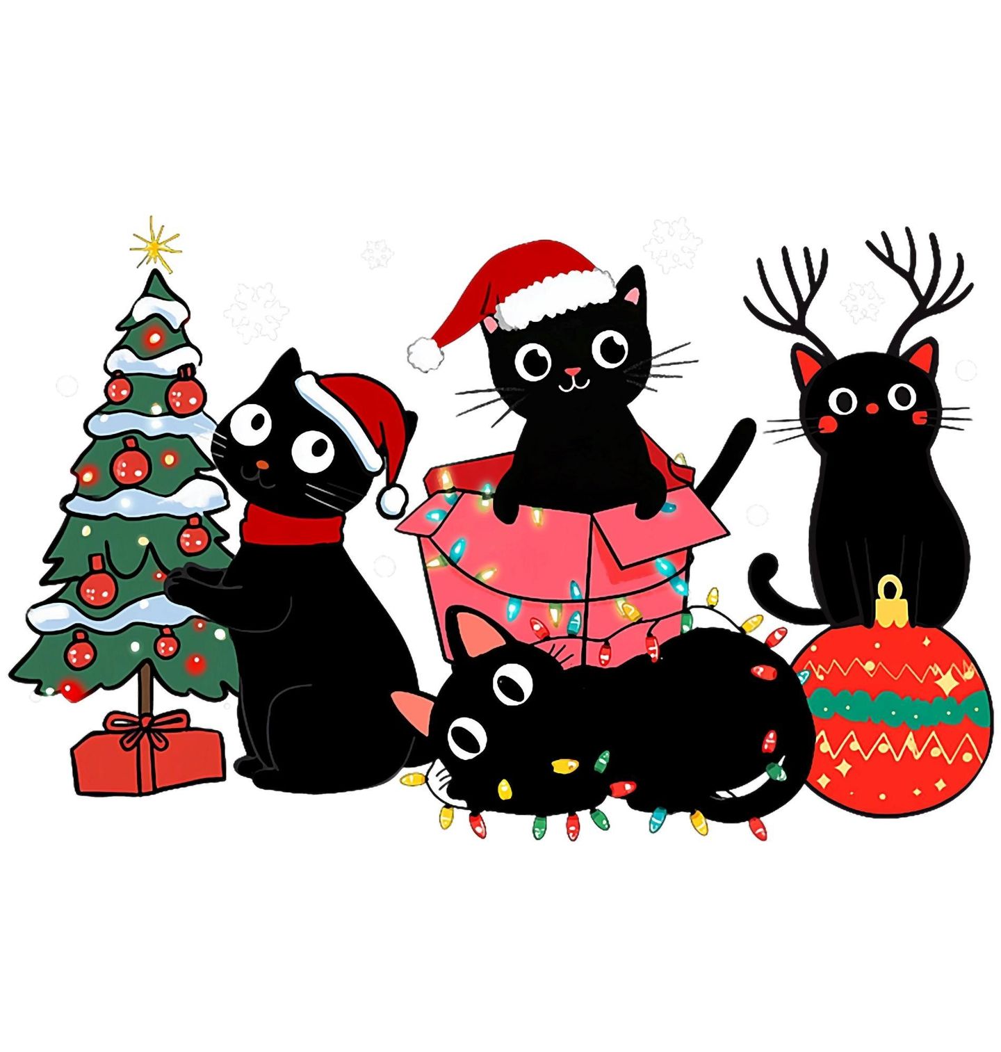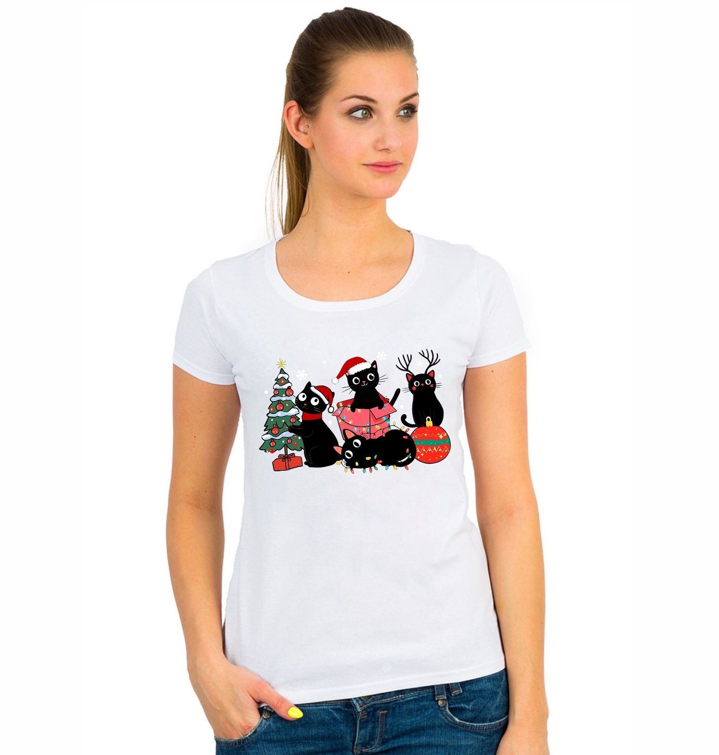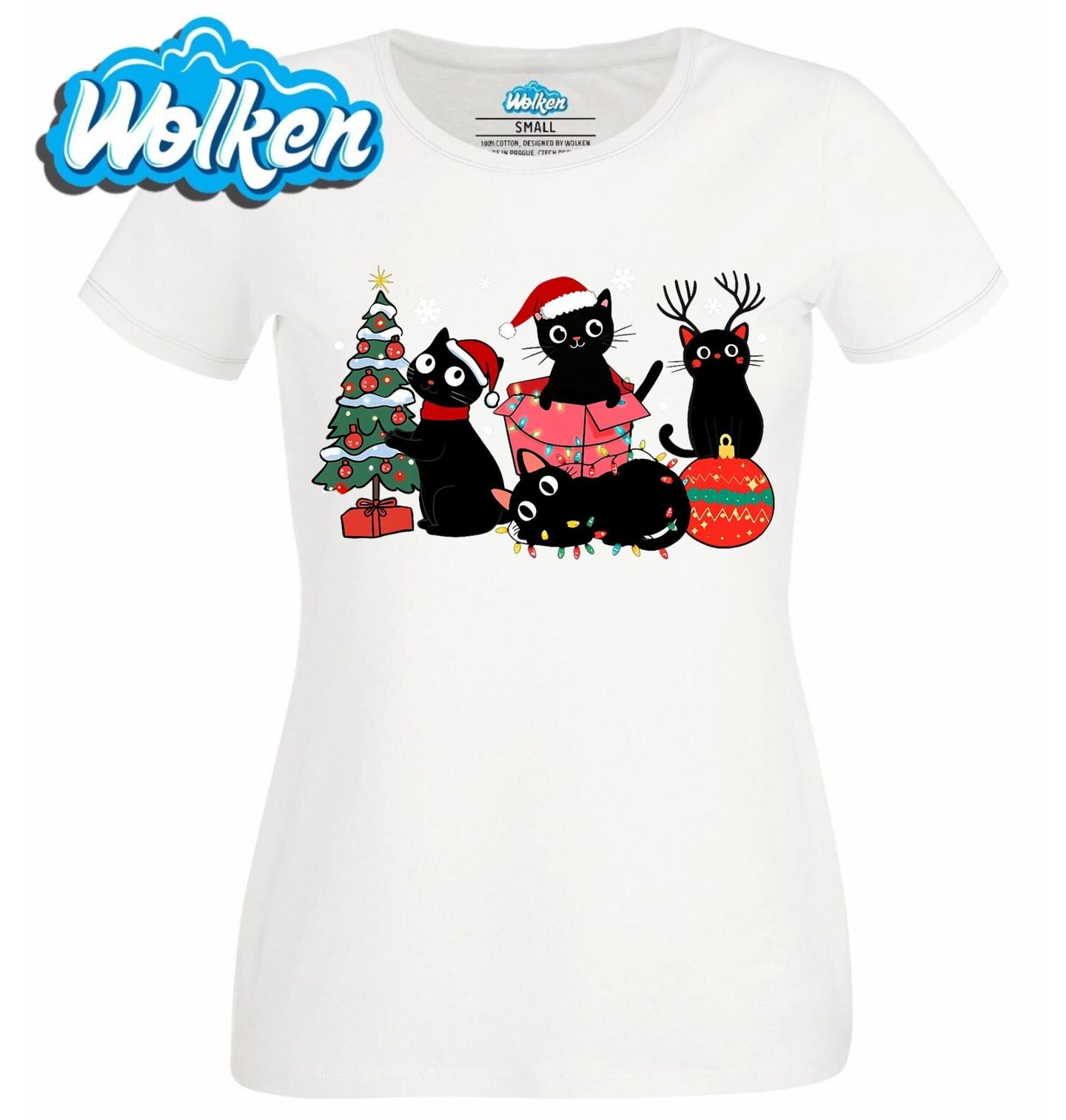 Dámské tričko Kočičí Vánoční Výzdoba. Čtyři černé kočky si užívají Vánoce – jedna kočka zdobí vánoční stromeček, další se ukrývá v dárkové krabici, jedna se proměnila v sobího pomocníka a poslední se zamotala do světýlek a koulí.