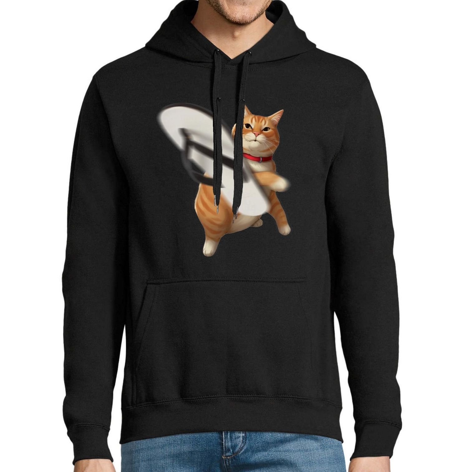Pánská mikina Kočka a Sandále. Tento vtipný motiv zachycuje, jak oranžová kočka energicky hází sandálem a působí jako nekompromisní ochránce svého území. Dynamická póza a výraz dodávají obrázku humor i akční nádech.