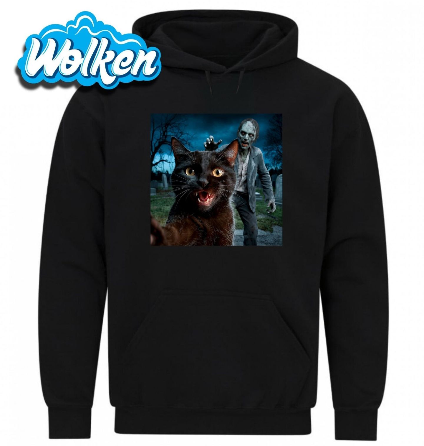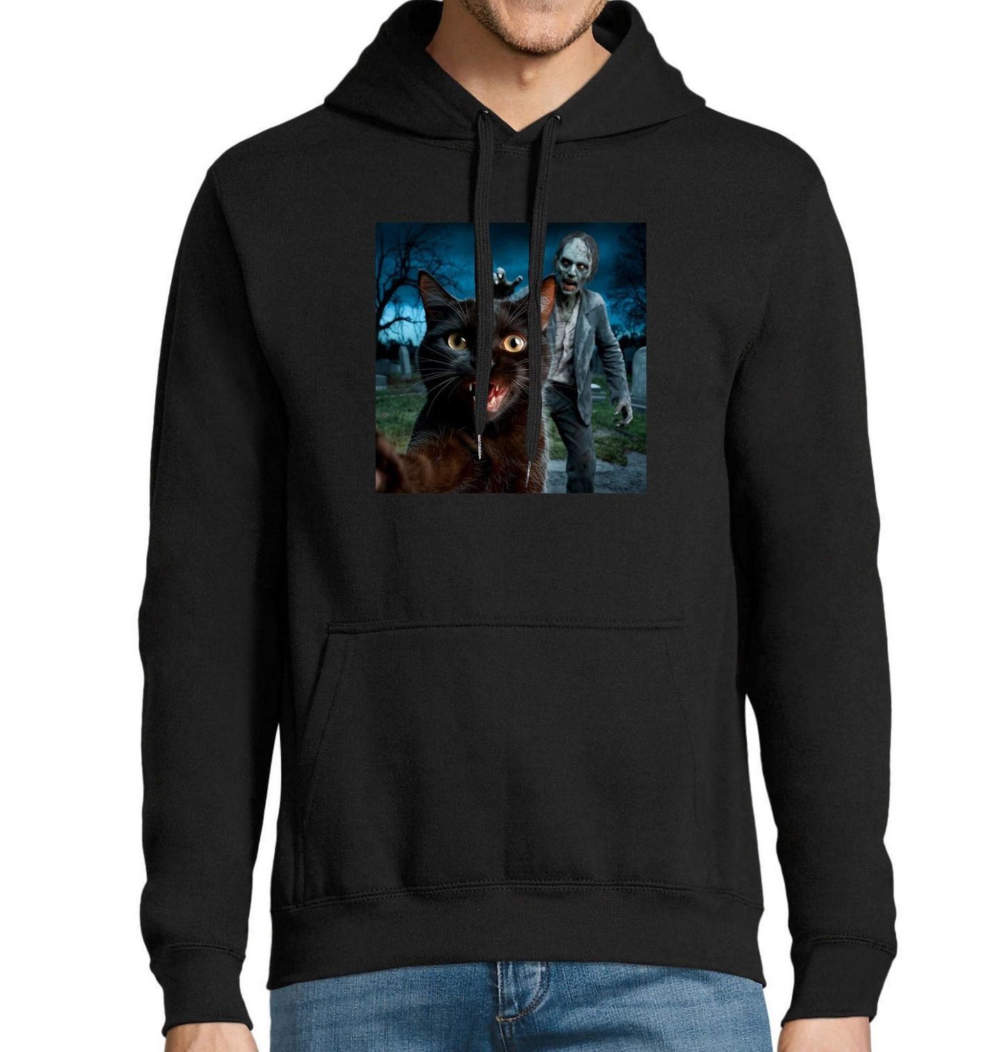 Pánská mikina Kočka a Zombie Selfie ze Hřbitova. Ideální pro milovníky koček, hororu a černého humoru. Tento design kombinuje roztomilost kočky s temnou atmosférou nočního hřbitova a napětím zombie apokalypsy. Perfektní volba na Halloween nebo pro každodenní nošení, pokud máte rádi neotřelé a strašidelné motivy.