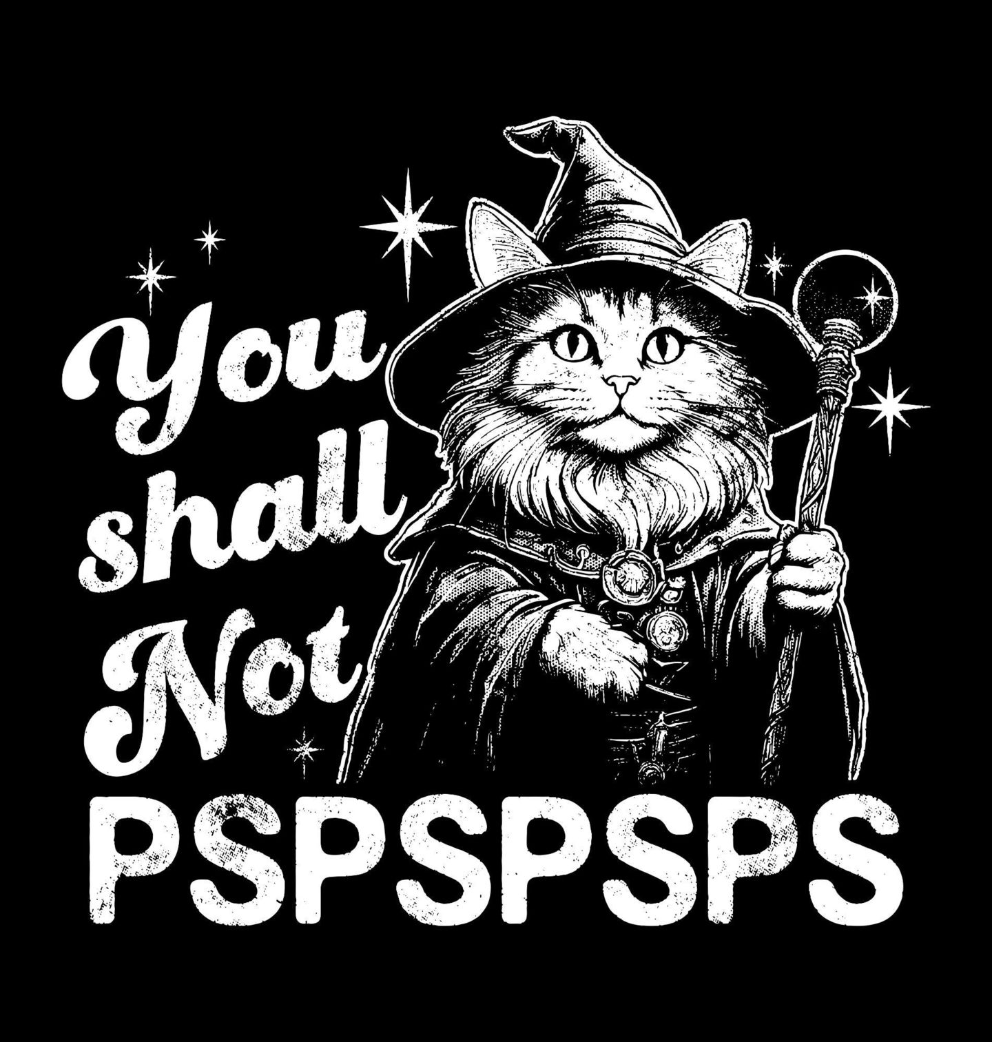 Dámské tričko Kočka Čarodějka. Roztomilá kočka oblečená jako čaroděj drží kouzelnou hůlku a obklopují ji malé hvězdy. Text „You shall not pspsps“ je humornou narážkou na slavnou větu z fantasy filmů a znamená „Ty nebudeš volat na kočku pspsps“. Motiv spojuje humor, fantasy atmosféru a lásku ke kočkám.