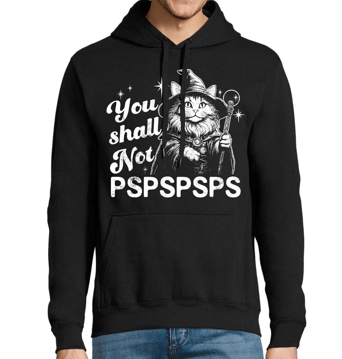Pánská mikina Kočka Čarodějka. Roztomilá kočka oblečená jako čaroděj drží kouzelnou hůlku a obklopují ji malé hvězdy. Text „You shall not pspsps“ je humornou narážkou na slavnou větu z fantasy filmů a znamená „Ty nebudeš volat na kočku pspsps“. Motiv spojuje humor, fantasy atmosféru a lásku ke kočkám.