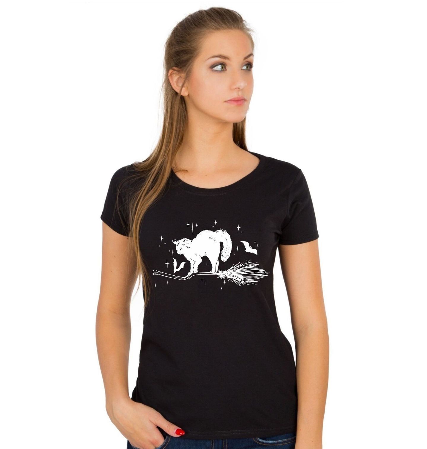 Dámské tričko Kočka Čarodějnice na koštěti. Stylový a tajemný motiv, kde odvážná kočka balancuje na létajícím koštěti uprostřed noční oblohy – jako pravá pomocnice čarodějnice. Doplněno o netopýry a hvězdy, tento design je ideální pro fanoušky Halloweenu, magie a tajuplné estetiky.