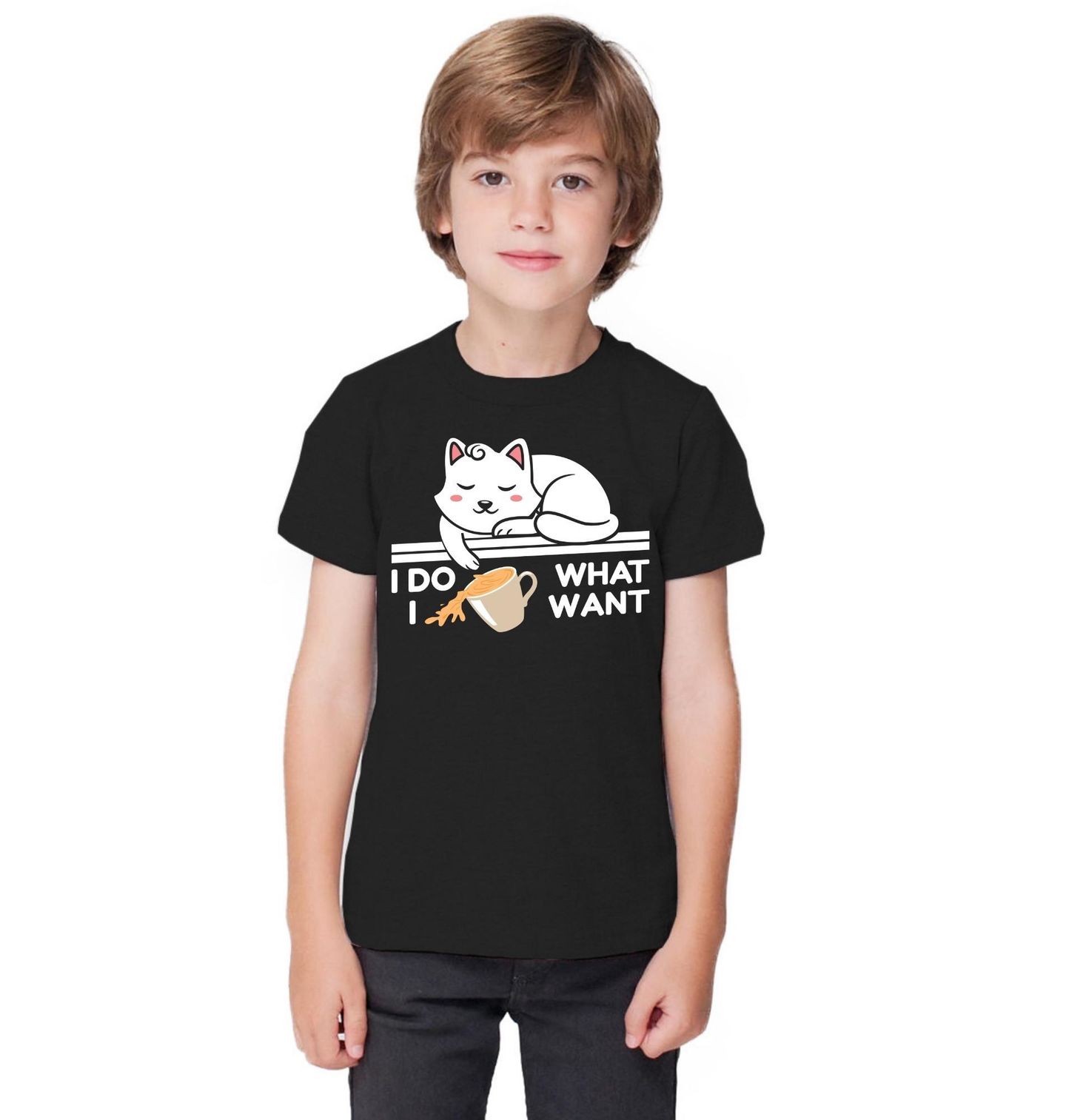 Dětské tričko Kočka I Do What I Want Dělám si, co chci. Vtipný motiv, kde roztomilá kočka leží na okraji a shazuje hrnek s kávou, dokonale vystihuje typickou kočičí povahu – dělá si prostě, co chce. Nápis na obrázku zní „I Do What I Want“, což v překladu znamená „Dělám si, co chci.“ Ideální design pro milovníky koček, humoru a pohodového životního stylu.