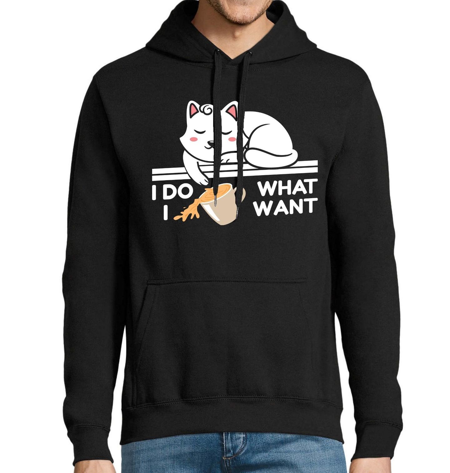 Pánská mikina Kočka I Do What I Want Dělám si, co chci. Vtipný motiv, kde roztomilá kočka leží na okraji a shazuje hrnek s kávou, dokonale vystihuje typickou kočičí povahu – dělá si prostě, co chce. Nápis na obrázku zní „I Do What I Want“, což v překladu znamená „Dělám si, co chci.“ Ideální design pro milovníky koček, humoru a pohodového životního stylu.