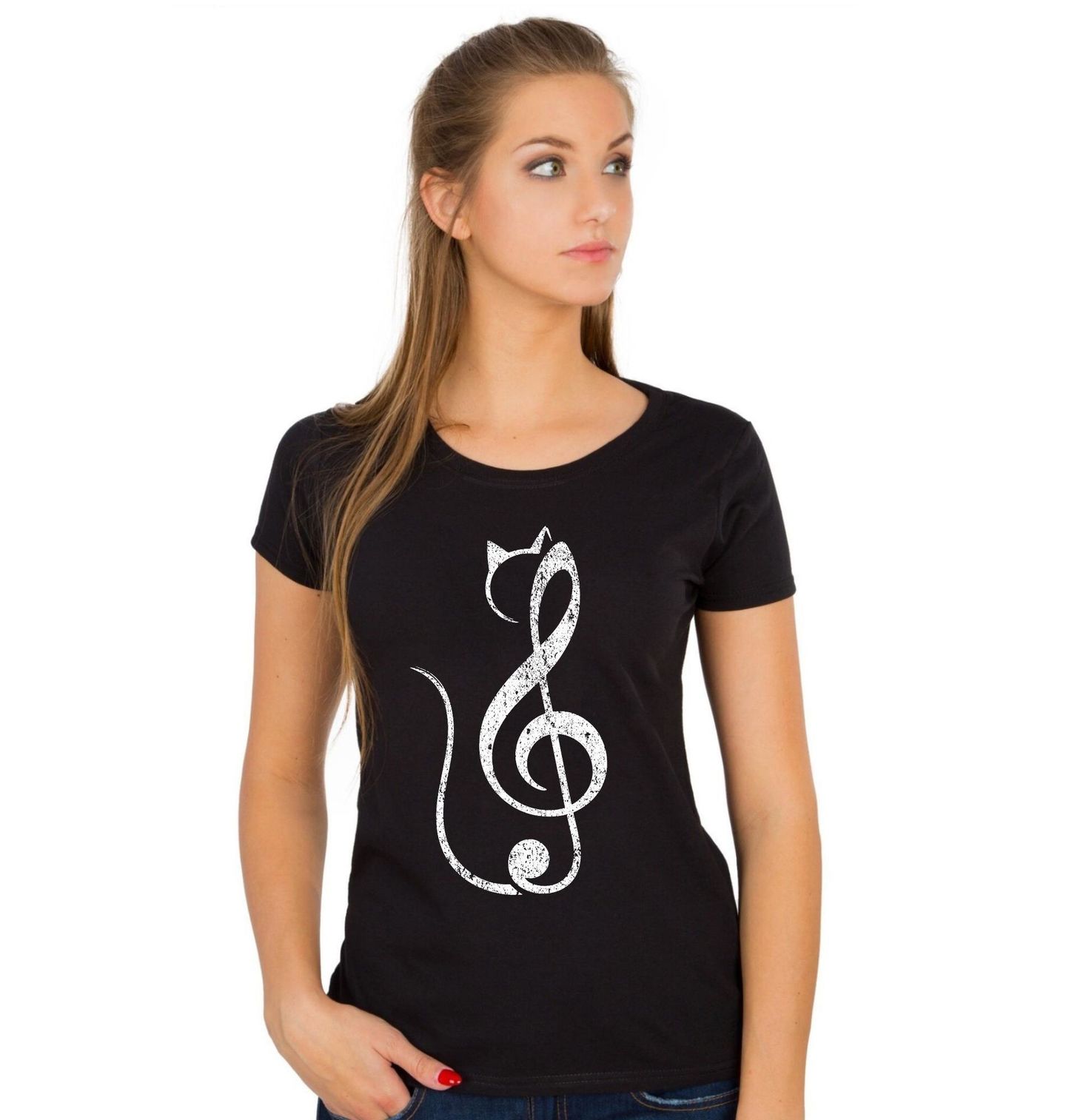 Dámské tričko Kočka jako Houslový Klíč. Originální design propojuje hudbu a zvířecí motivy do jednoho symbolu. Silueta kočky je stylizovaná do tvaru houslového klíče, což vytváří jedinečný hudební znak. Tento motiv je ideální pro všechny, kteří milují hudbu a zároveň mají slabost pro kočky.