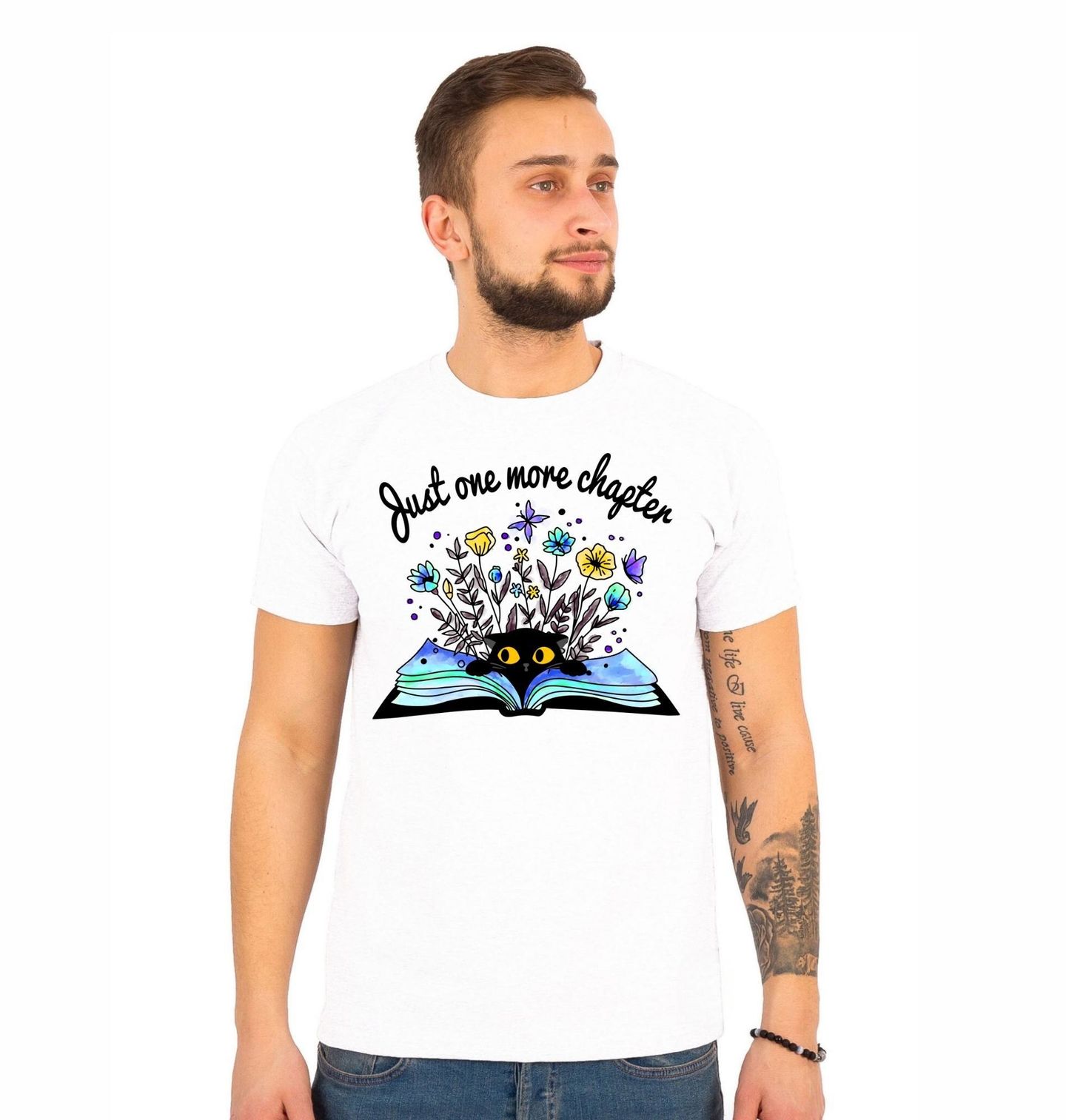 Pánské tričko Kočka Ještě jedna kapitola Just one more chapter. Ilustrace zobrazuje kočku vykukující z otevřené knihy, ze které vyrůstají barevné květiny a fantazijní prvky, které symbolizují svět příběhů a představivosti. Text na motivu zní: „Just one more chapter“, což v překladu znamená: „Ještě jedna kapitola“. Tento nápis dokonale vystihuje všechny milovníky knih, kteří si vždy říkají, že už opravdu přečtou jen kousek… a nakonec nemohou přestat.
