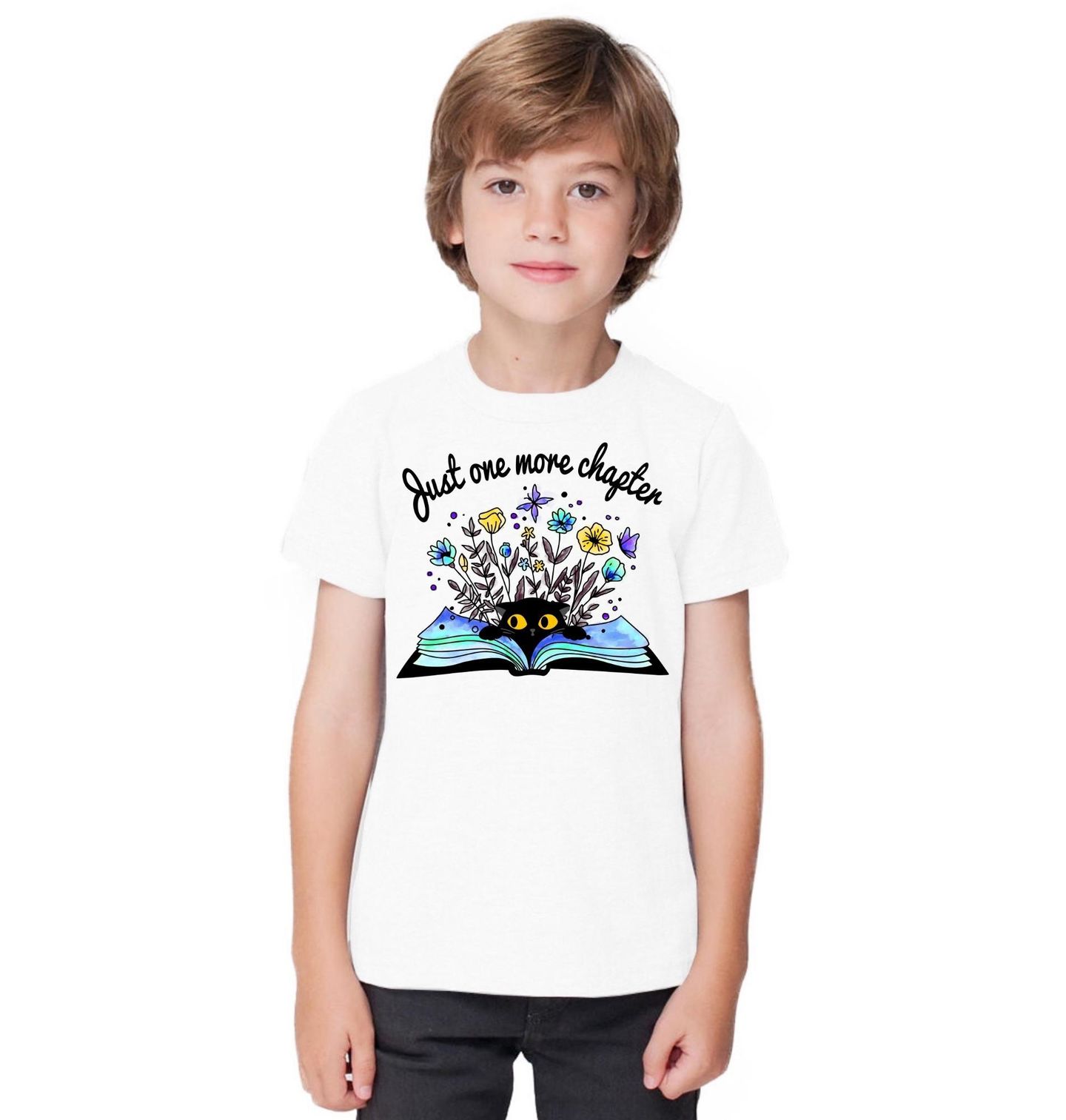 Dětské tričko Kočka Ještě jedna kapitola Just one more chapter. Ilustrace zobrazuje kočku vykukující z otevřené knihy, ze které vyrůstají barevné květiny a fantazijní prvky, které symbolizují svět příběhů a představivosti. Text na motivu zní: „Just one more chapter“, což v překladu znamená: „Ještě jedna kapitola“. Tento nápis dokonale vystihuje všechny milovníky knih, kteří si vždy říkají, že už opravdu přečtou jen kousek… a nakonec nemohou přestat.