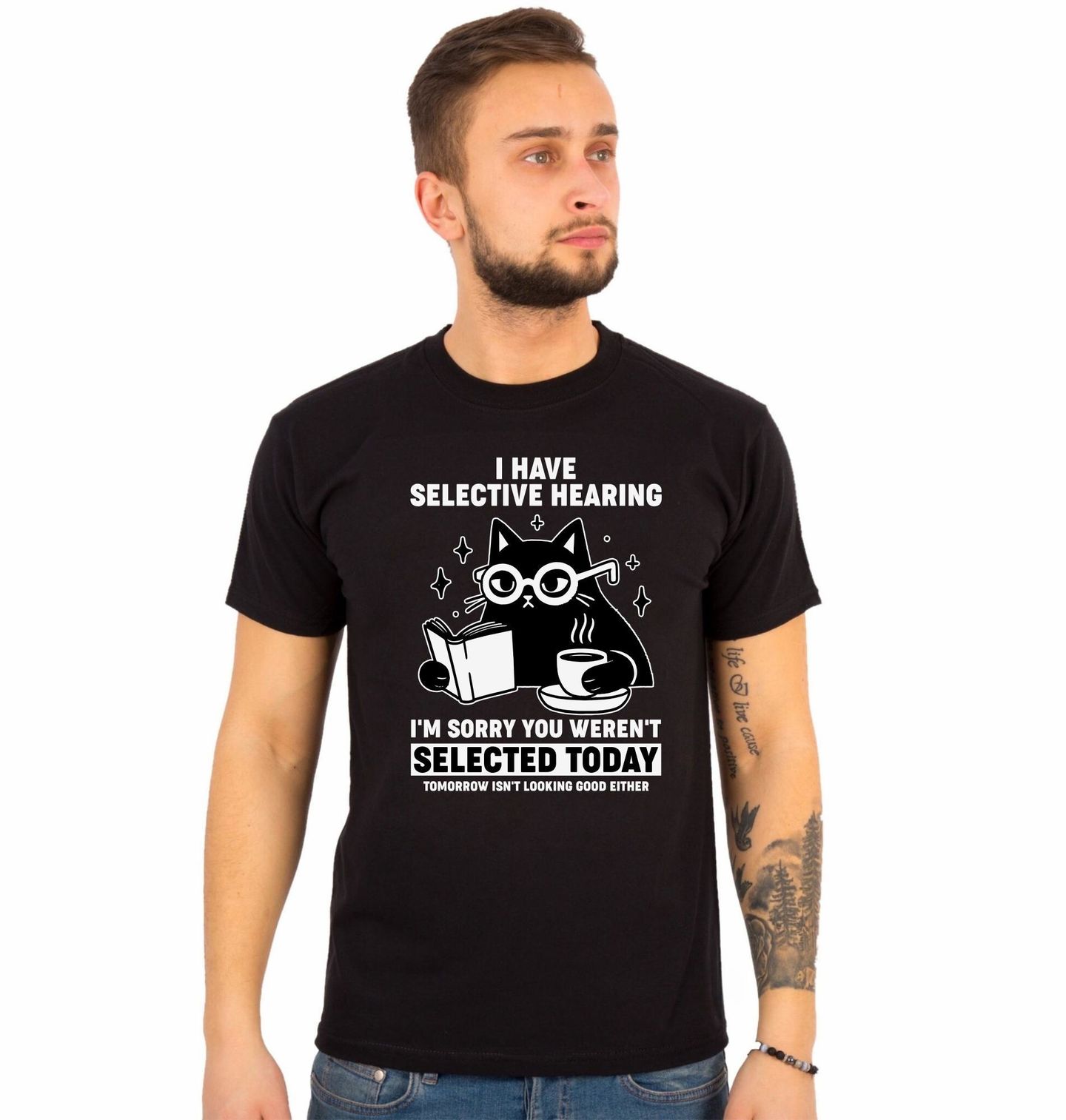 Pánské tričko Kočka Mám selektivní sluch. Promiň, dnes jsi nebyl vybrán. Ilustrace zobrazuje kočku s brýlemi, která si v klidu čte knihu a popíjí kávu, zatímco ignoruje okolní svět – přesně tak, jak to umí jen kočka. “I HAVE SELECTIVE HEARING. I'M SORRY YOU WEREN'T SELECTED TODAY. TOMORROW ISN'T LOOKING GOOD EITHER.” Překlad: „Mám selektivní sluch. Promiň, dnes jsi nebyl vybrán. A zítřek nevypadá o nic lépe.“