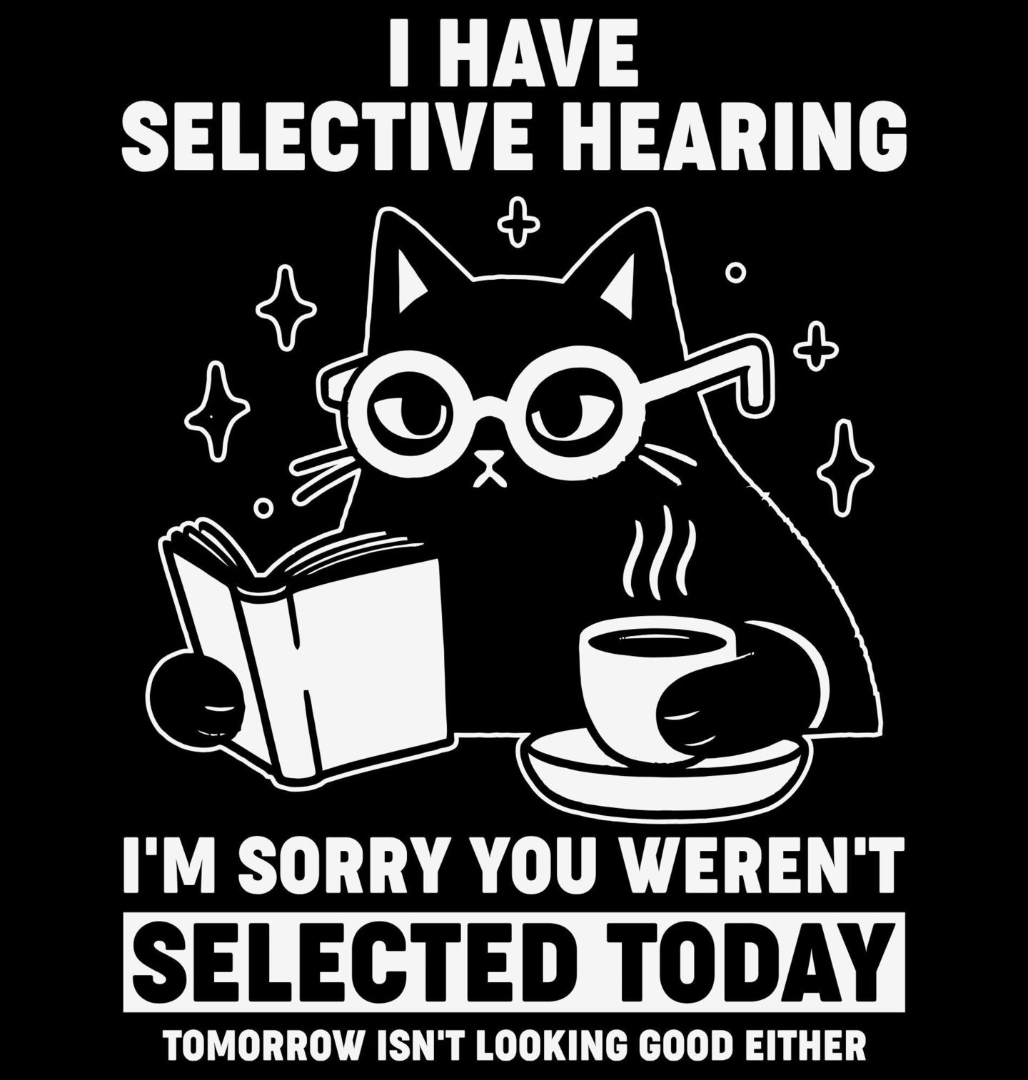 Dámské tričko Kočka Mám selektivní sluch. Promiň, dnes jsi nebyl vybrán. Ilustrace zobrazuje kočku s brýlemi, která si v klidu čte knihu a popíjí kávu, zatímco ignoruje okolní svět – přesně tak, jak to umí jen kočka. “I HAVE SELECTIVE HEARING. I'M SORRY YOU WEREN'T SELECTED TODAY. TOMORROW ISN'T LOOKING GOOD EITHER.” Překlad: „Mám selektivní sluch. Promiň, dnes jsi nebyl vybrán. A zítřek nevypadá o nic lépe.“