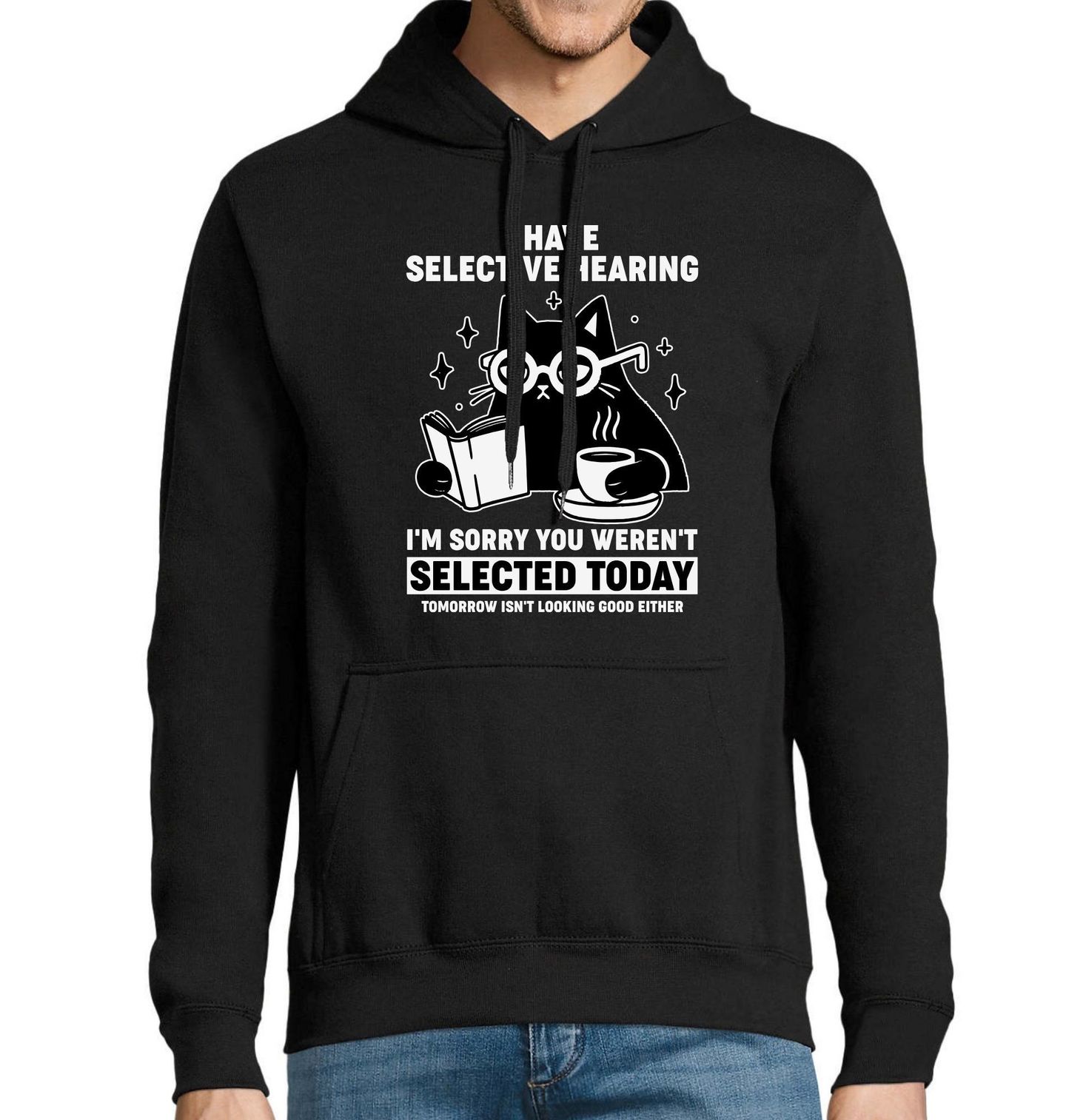 Pánská mikina Kočka Mám selektivní sluch. Promiň, dnes jsi nebyl vybrán. Ilustrace zobrazuje kočku s brýlemi, která si v klidu čte knihu a popíjí kávu, zatímco ignoruje okolní svět – přesně tak, jak to umí jen kočka. “I HAVE SELECTIVE HEARING. I'M SORRY YOU WEREN'T SELECTED TODAY. TOMORROW ISN'T LOOKING GOOD EITHER.” Překlad: „Mám selektivní sluch. Promiň, dnes jsi nebyl vybrán. A zítřek nevypadá o nic lépe.“