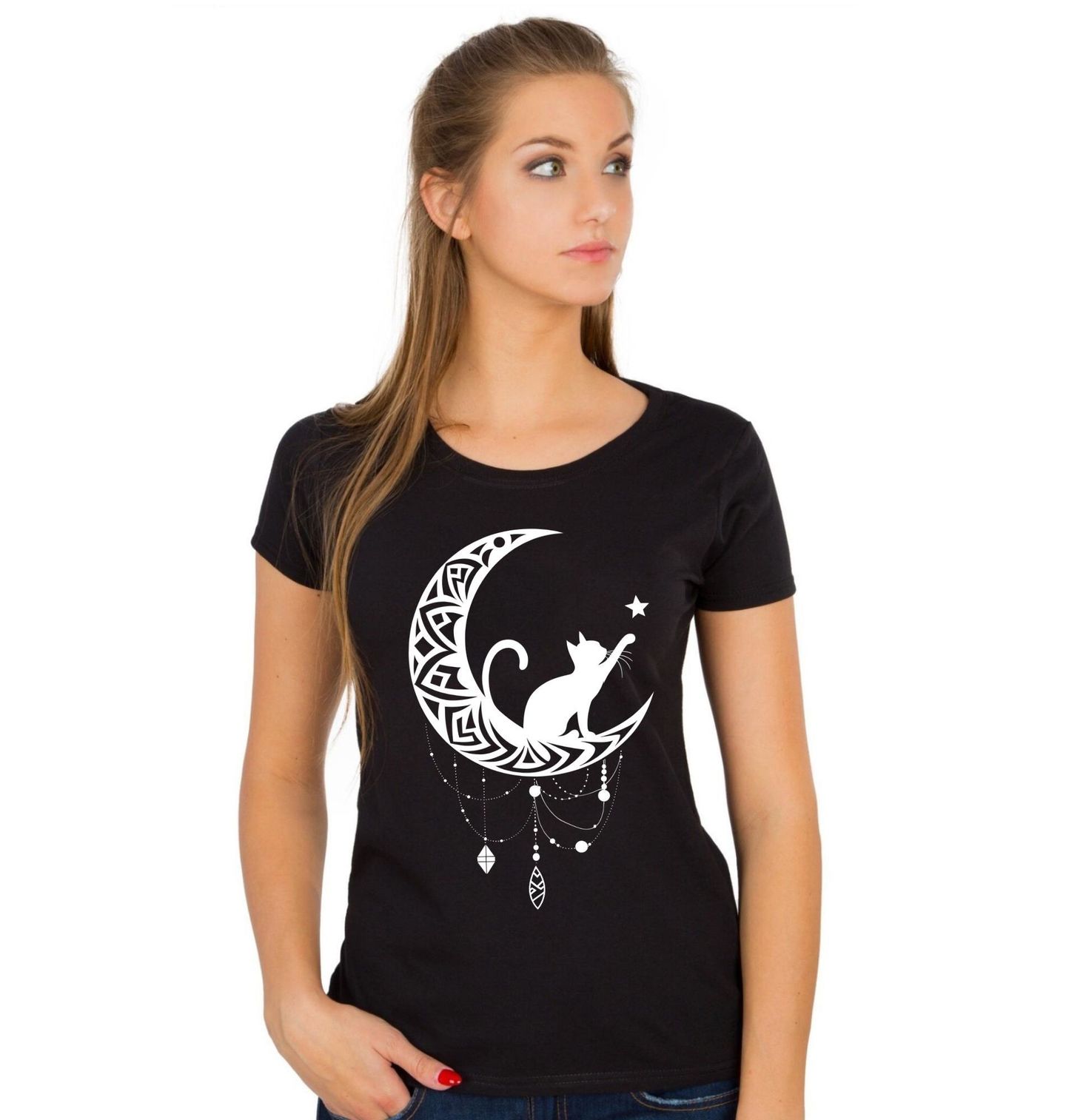 Dámské tričko Kočka na Srpku Měsíce. Jemný a elegantní motiv přináší kouzelnou atmosféru noci plné hvězd a snů. Ilustrace zobrazuje siluetu, kterou je kočka sedící na zdobeném srpku, jak se natahuje po hvězdě. Celý motiv doplňují dekorativní prvky připomínající šperky a vesmírné ornamenty, které podtrhují mystický nádech.