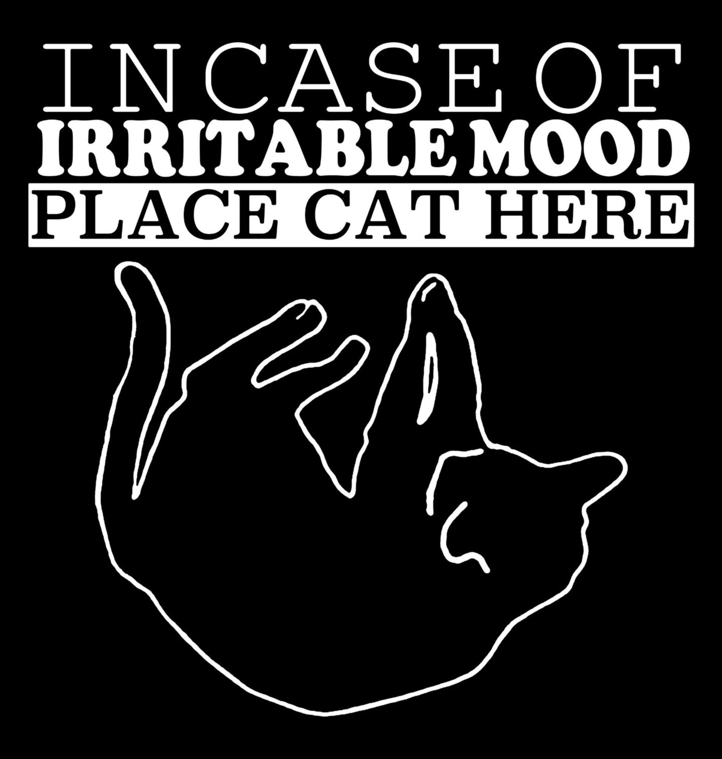 Pánská mikina Kočka na Uklidnění. Jednoduchá kresba ukazuje siluetu, kde kočka slouží jako symbol uklidnění. Text „In case of irritable mood place cat here“ znamená „V případě podrážděné nálady umístěte kočku sem“. Vtipný a trefný motiv pro každodenní život milovníků koček.