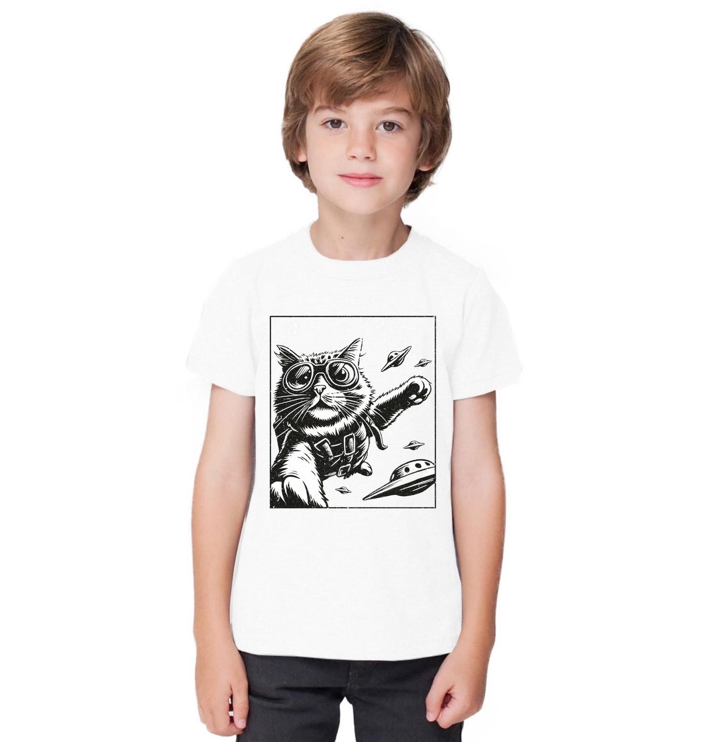 Dětské tričko Kočka Parašutista mezi UFO. Originální ilustrace vesmírné kočky parašutisty zaujme na první pohled svým jedinečným stylem a hravou atmosférou. Stylizovaná kočka s leteckými brýlemi a postrojem se vznáší ve vesmíru mezi tajemnými UFO, což vytváří perfektní kombinaci sci-fi designu, humoru a originality.