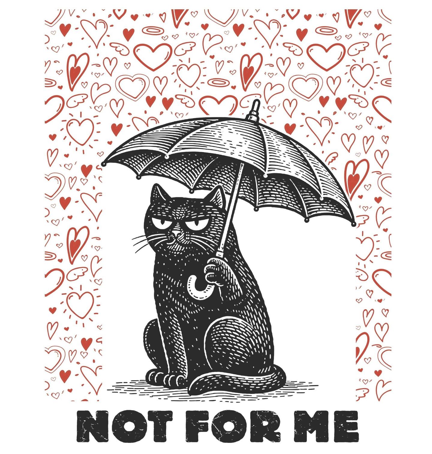 Dámské tričko Kočka pod Deštníkem Not for me. „To není pro mě.“ Kočka, která sedí pod deštníkem a dává jasně najevo svůj postoj k lásce a zamilovanosti. Minimalistický černobílý design doplněný červenými srdíčky působí hravě, ale zároveň lehce ironicky. Ideální motiv pro milovníky koček, humoru a originálních ilustrací.
