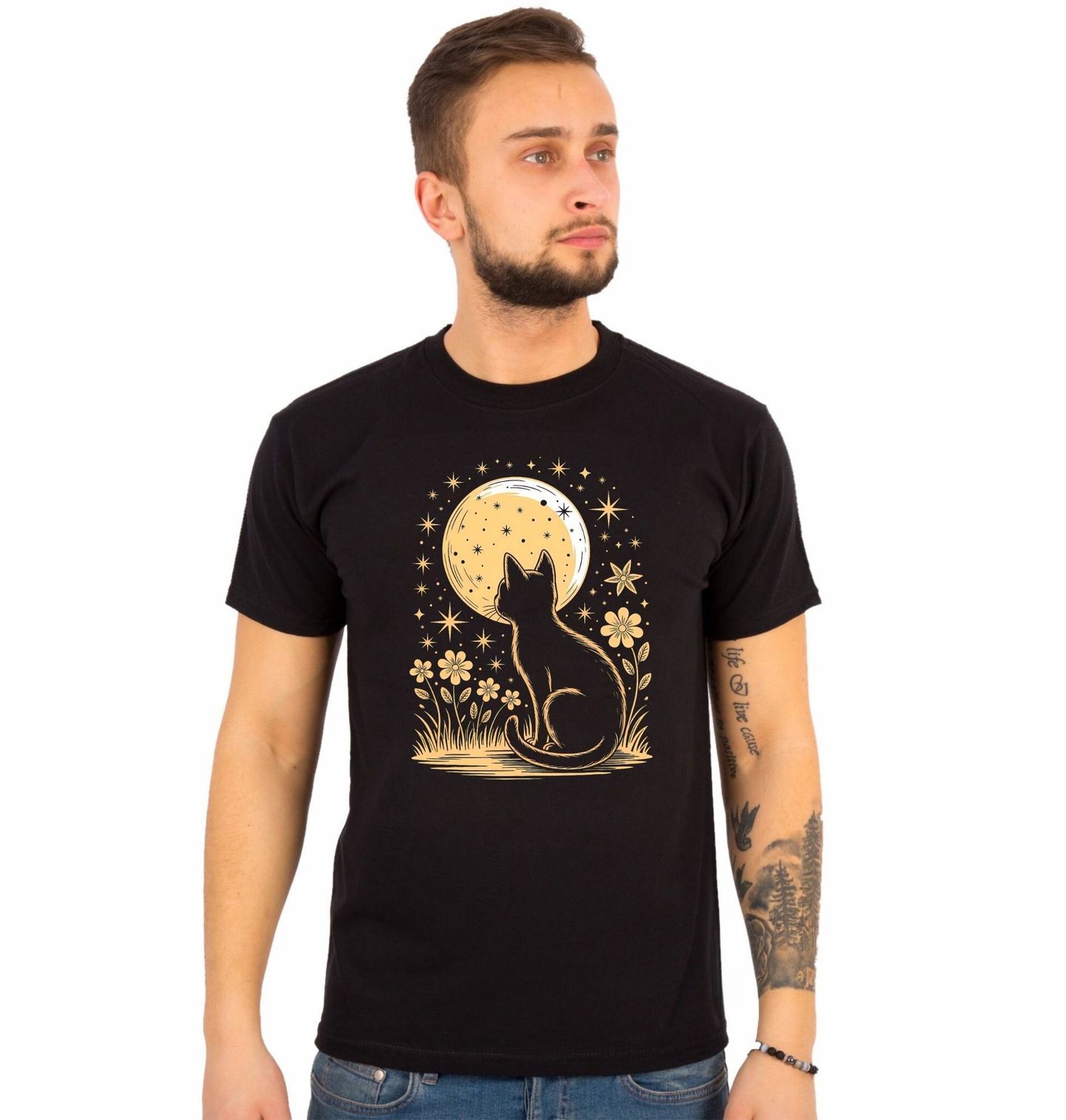 Pánské tričko Kočka pod Hvězdnou Oblohou. Tichá noc, hvězdy nad hlavou a kočka, která tiše sleduje zářící měsíc... Tento nádherný potisk zachycuje klidnou a kouzelnou atmosféru noci, kterou ocení každý milovník koček, přírody i snění. Skvělé jako dárek i každodenní kousek, který působí elegantně a snově.