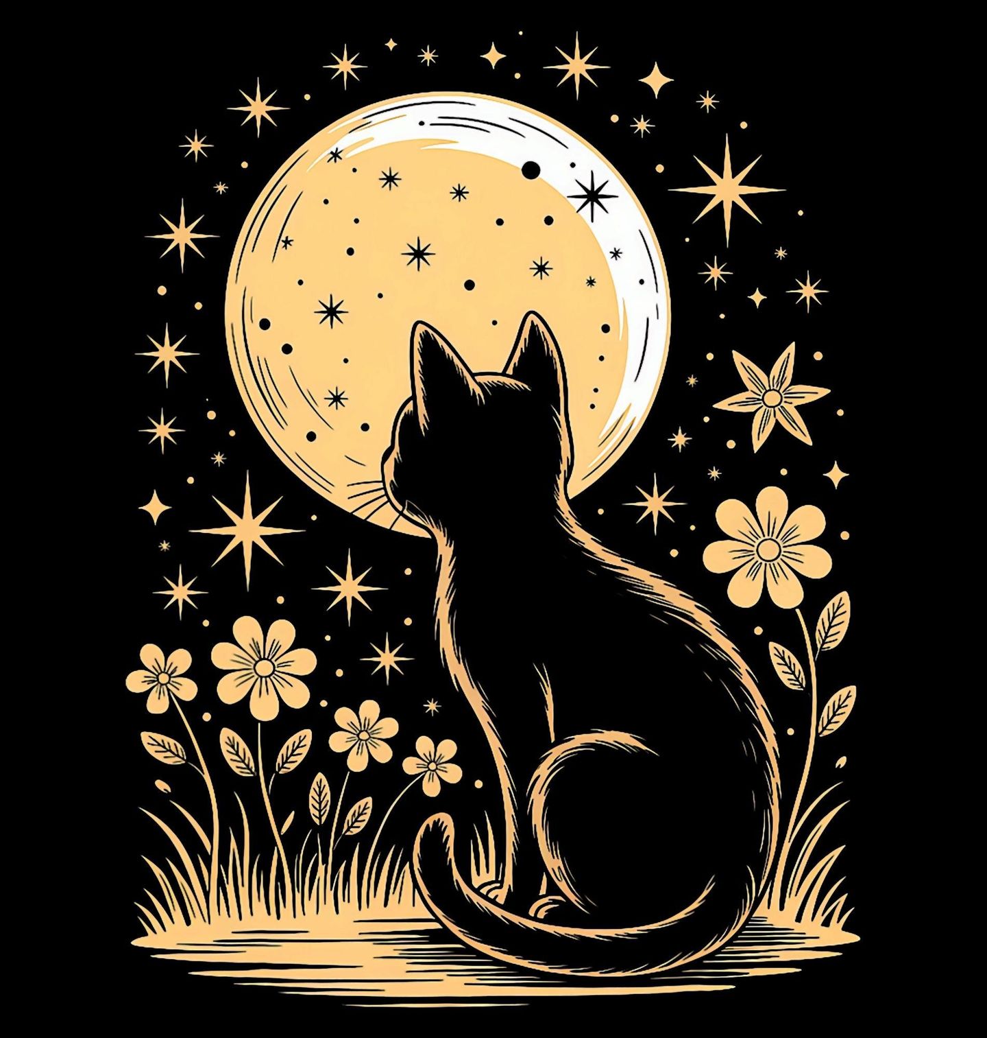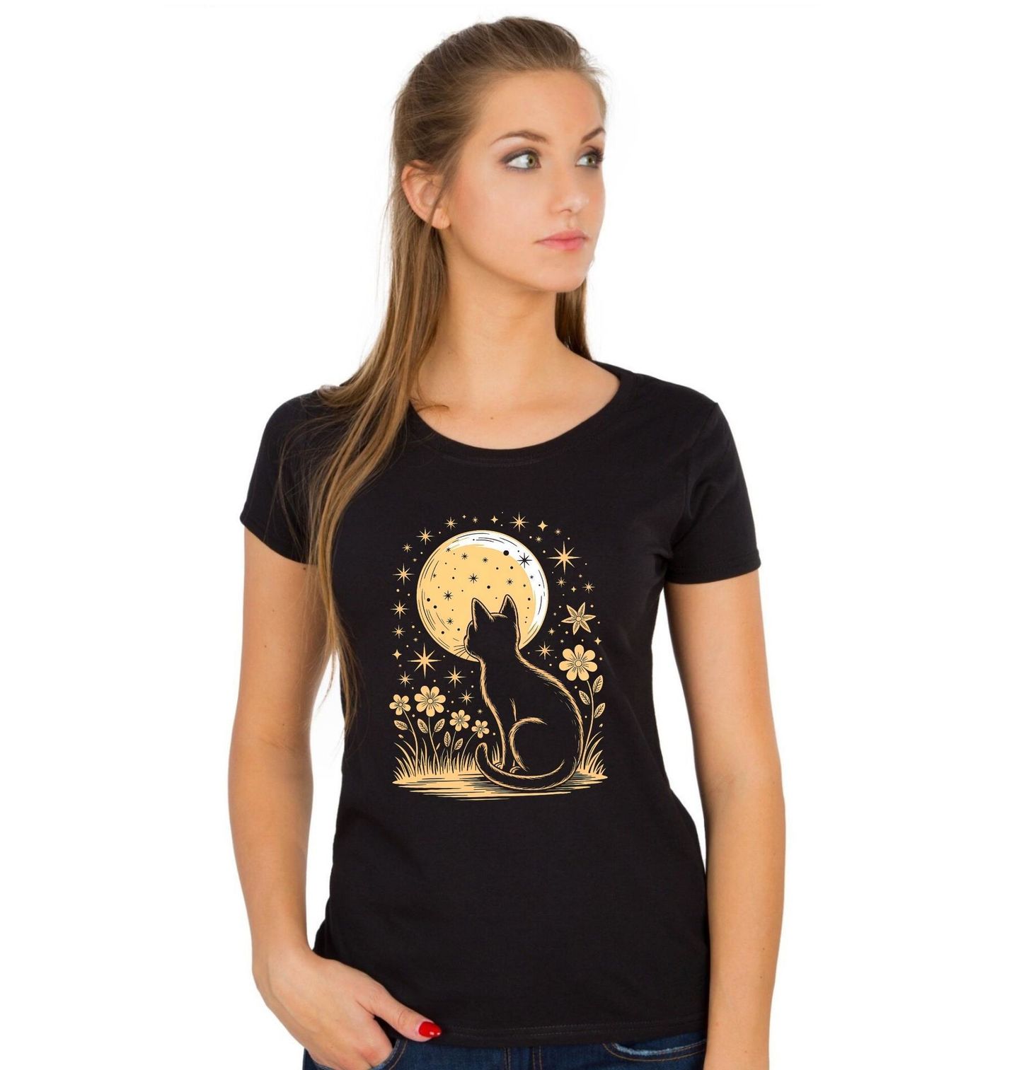 Dámské tričko Kočka pod Hvězdnou Oblohou. Tichá noc, hvězdy nad hlavou a kočka, která tiše sleduje zářící měsíc... Tento nádherný potisk zachycuje klidnou a kouzelnou atmosféru noci, kterou ocení každý milovník koček, přírody i snění. Skvělé jako dárek i každodenní kousek, který působí elegantně a snově.