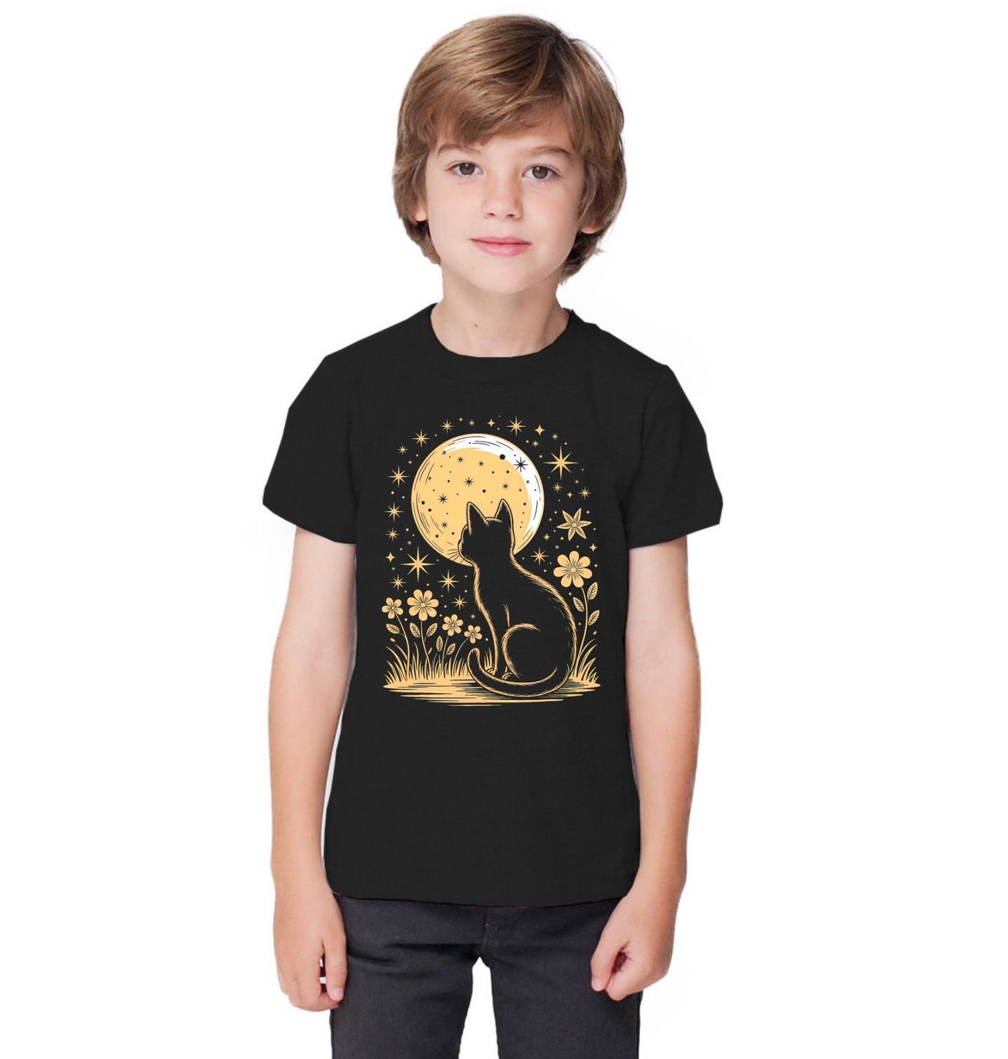 Dětské tričko Kočka pod Hvězdnou Oblohou. Tichá noc, hvězdy nad hlavou a kočka, která tiše sleduje zářící měsíc... Tento nádherný potisk zachycuje klidnou a kouzelnou atmosféru noci, kterou ocení každý milovník koček, přírody i snění. Skvělé jako dárek i každodenní kousek, který působí elegantně a snově.