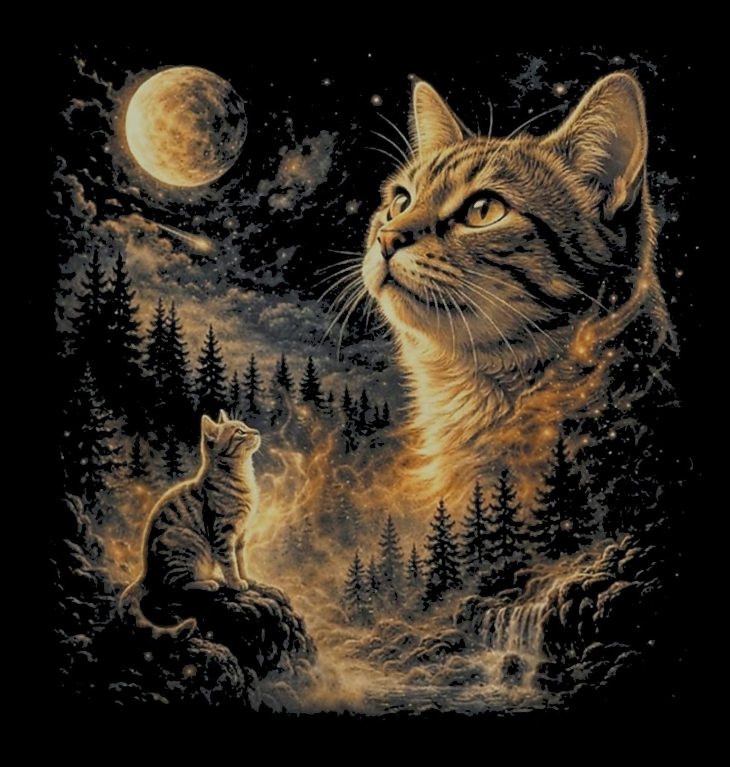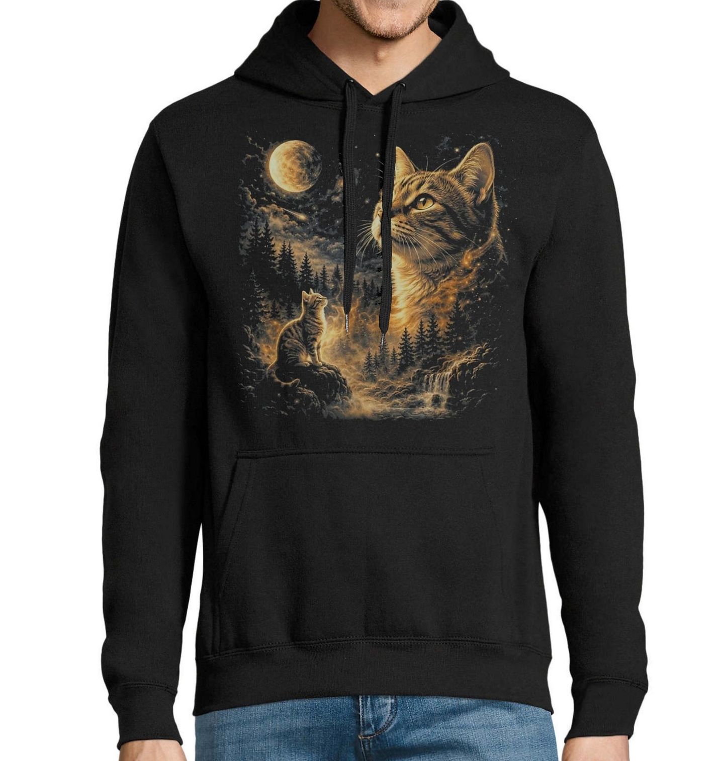 Pánská mikina Mourovatá Kočka pod Hvězdnou Oblohou. Elegantní kočka hledí do dálky v mystické noční krajině zalité měsíčním světlem. Obklopená lesem a hvězdami působí jako duchovní průvodce nebo ochránce přírody. Tento motiv vyzařuje klid, sílu a propojení s přírodou, kde kočka symbolizuje intuici a tajemství noci.