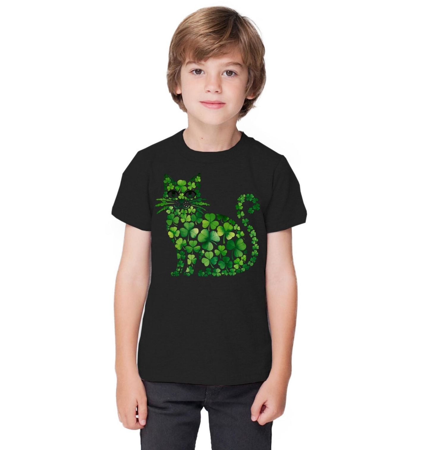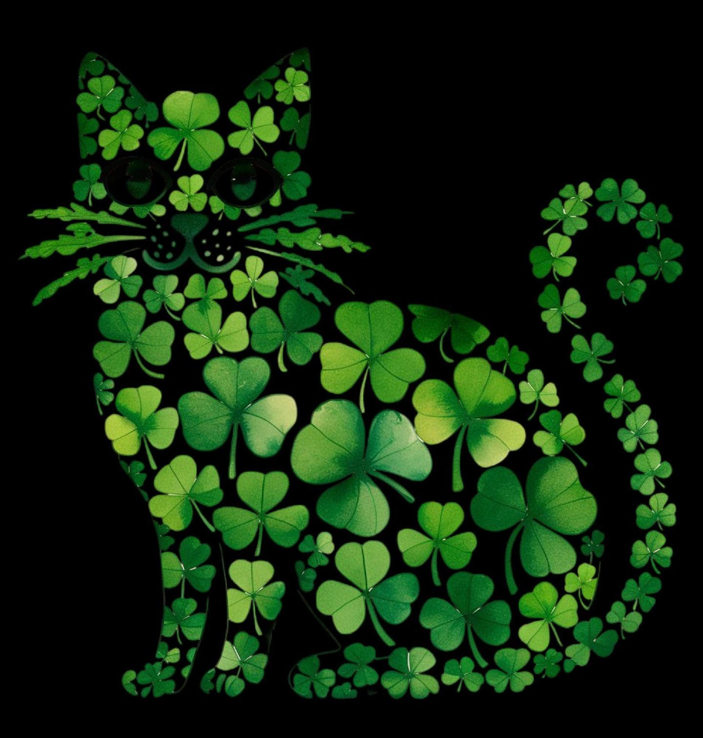 Dětské tričko Kočka pro Štěstí. Silueta kočky je tvořena množstvím čtyřlístků, které jsou tradičním symbolem štěstí a dobré náhody. Výrazná zelená barva na tmavém pozadí dodává motivu svěží a magický vzhled. Kočka zde představuje tajemství, intuici a nezávislost, zatímco čtyřlístek přináší štěstí do každodenního života.