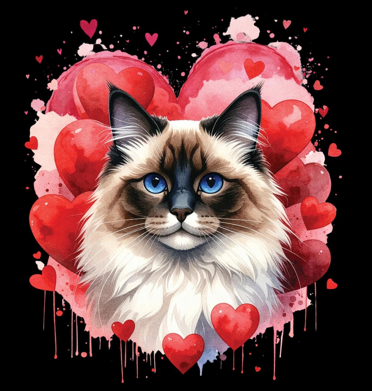 Dětské tričko Kočka Ragdoll mezi Srdci. Kočka Ragdoll je známá svou klidnou a mazlivou povahou, díky čemuž je tento motiv ideální pro všechny milovníky koček, romantických designů a elegantních ilustrací. Design působí hřejivě, láskyplně a zároveň luxusně, takže se skvěle hodí jako dárek nebo stylový doplněk pro každého, kdo miluje kočky a plemeno Ragdoll.