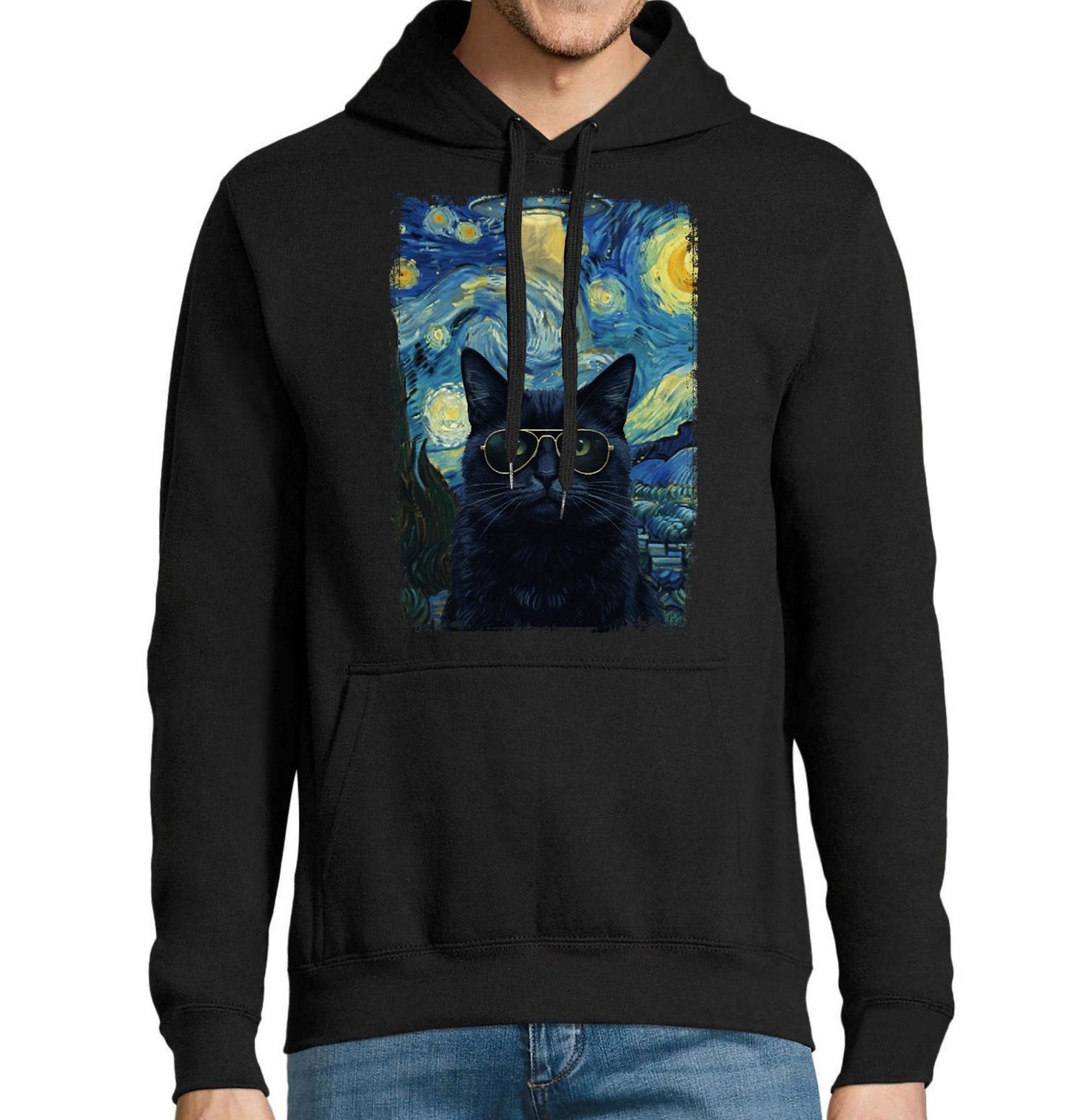 Pánská mikina Kočka s Brýlemi ve Hvězdné Noci. Elegantní černá kočka s brýlemi stojí před uměleckým pozadím inspirovaným slavnou malbou Hvězdné noci. Autorem tohoto uměleckého díla je významný malíř Vincent van Gogh, avšak v díle je přidán futuristický prvek UFO. Tento motiv spojuje umění a styl, přičemž kočka působí tajemně a sofistikovaně. Skvělá volba pro milovníky umění i koček.