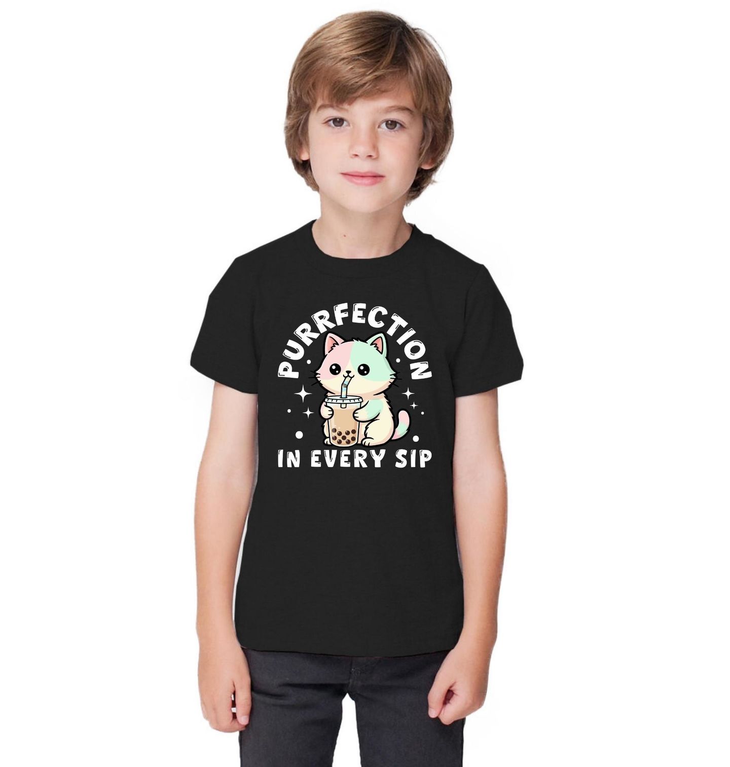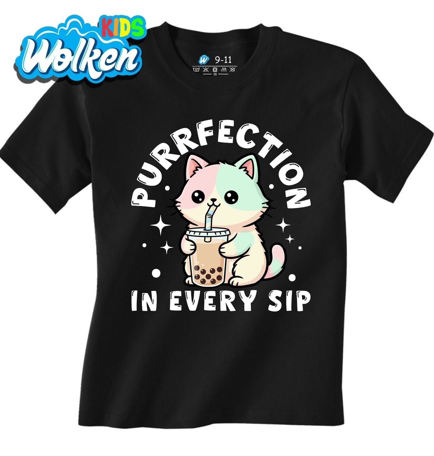 Dětské tričko Kočka s Bubble Tea Purrfection in every sip. Tento motiv spojuje dvě neodolatelné věci – předení roztomilé kočky a sladký nápoj bubble tea. „Purrfection in every sip“ = "Mňoukající dokonalost v každém doušku" dokonale vystihuje kouzlo tohoto designu: každé napití přináší dávku radosti, stejně jako přítomnost kočičího společníka.