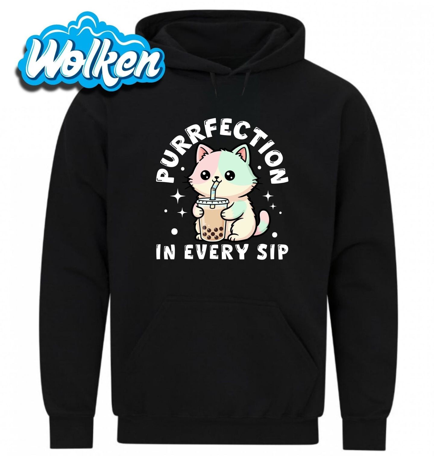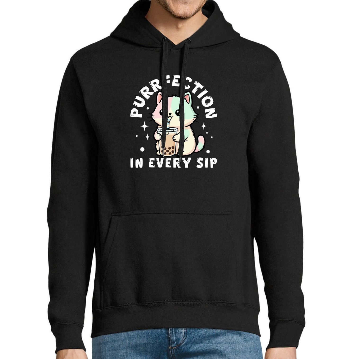 Pánská mikina Kočka s Bubble Tea Purrfection in every sip. Tento motiv spojuje dvě neodolatelné věci – předení roztomilé kočky a sladký nápoj bubble tea. „Purrfection in every sip“ = "Mňoukající dokonalost v každém doušku" dokonale vystihuje kouzlo tohoto designu: každé napití přináší dávku radosti, stejně jako přítomnost kočičího společníka.