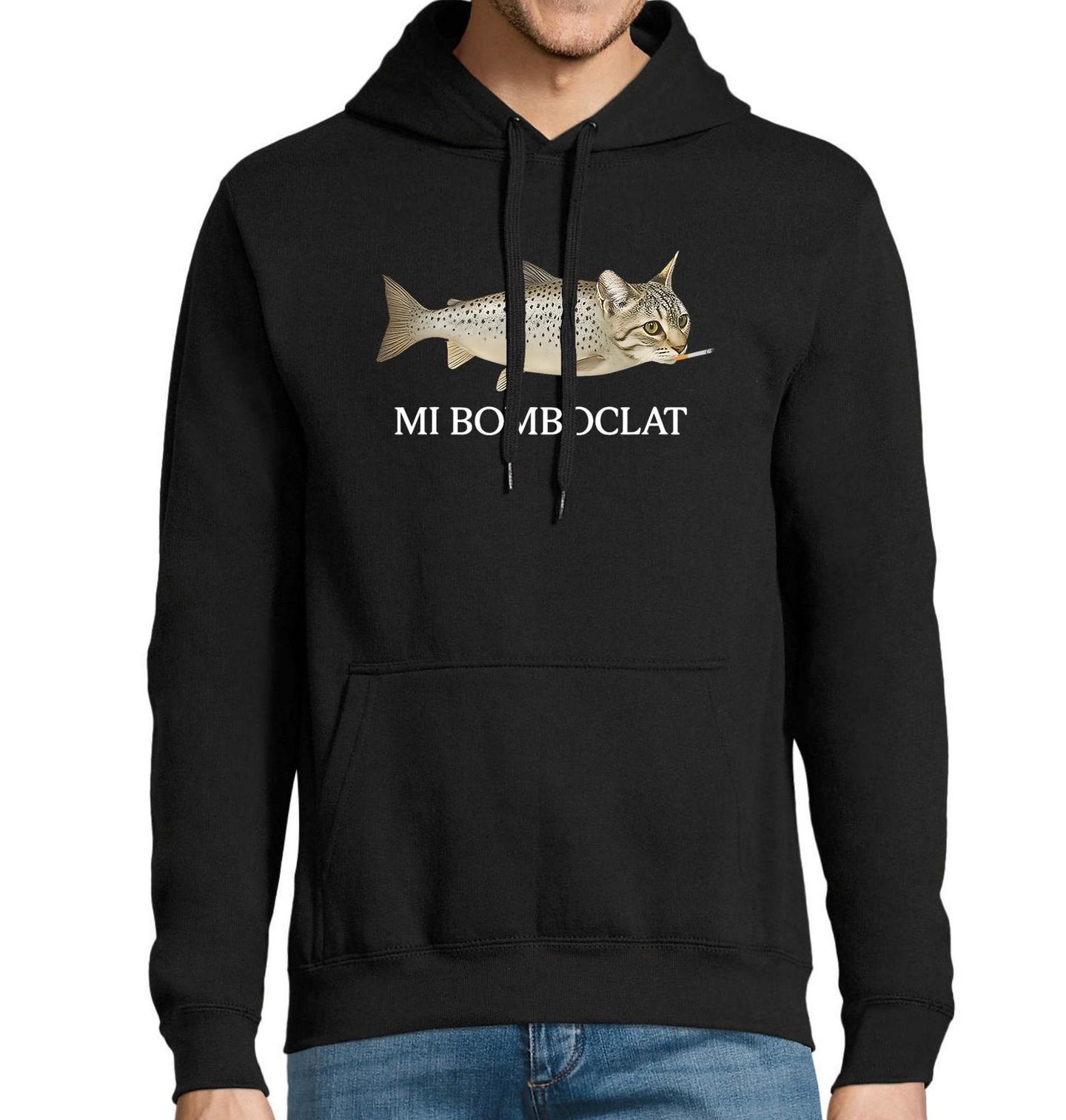Pánská mikina Kočka s Cigaretou MI BOMBOCLAT. Tělo ryby, hlava kočky a v tlamičce nechybí cigareta – kombinace, která nemá logiku, ale právě proto funguje dokonale. Slovo bomboclaat (bumboclaat) je původně jamaicanský slang z patois používaný jako výraz překvapení nebo šoku, podobně jako „co to sakra je?“. Na internetu se stal populárním meme formátem, který přesně vystihuje moderní brainrot humor.