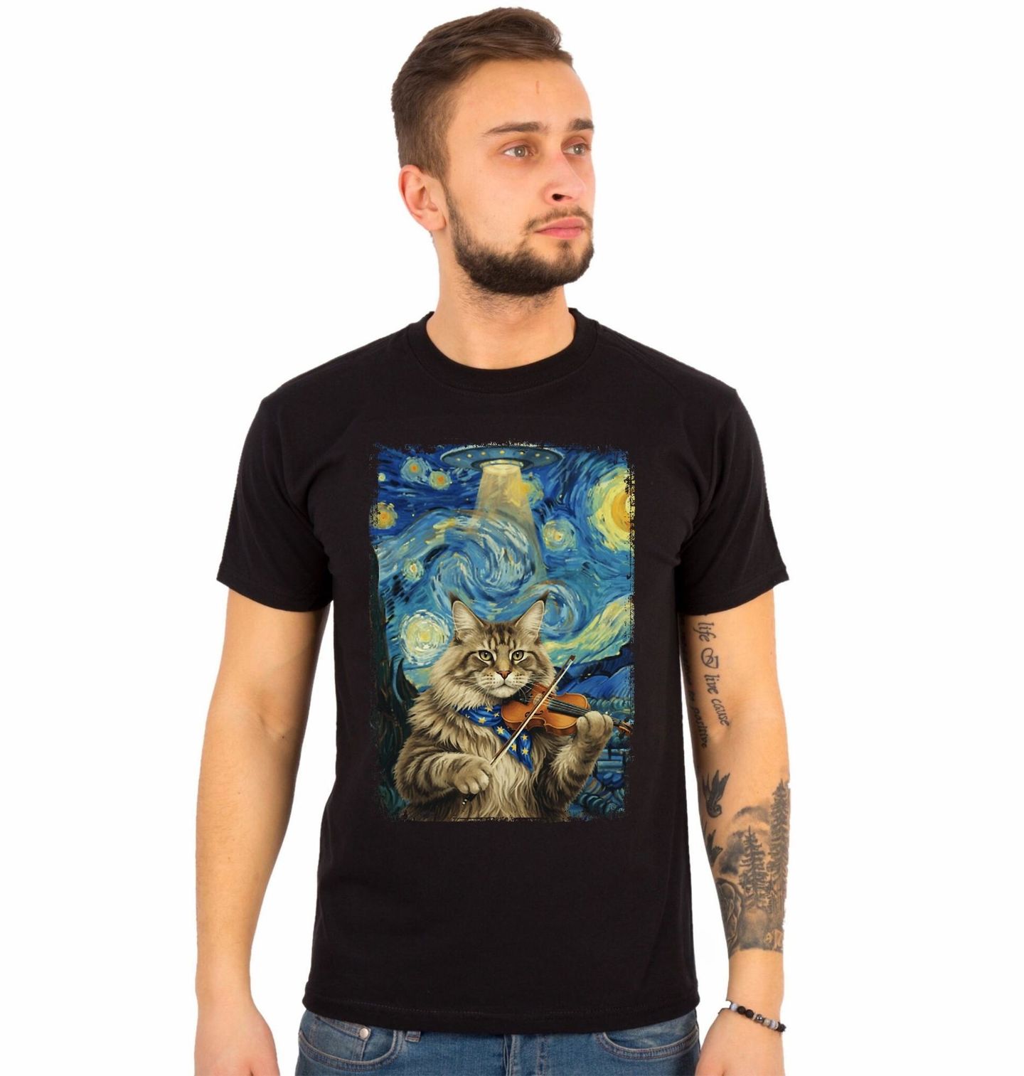 Pánské tričko Kočka s Houslemi ve Hvězdné Noci. Motiv spojující hudbu, umění a fantazii. Elegantní kočka hraje na housle před ikonickým pozadím inspirovaným obrazem Hvězdná noc, který namaloval slavný malíř Vincent van Gogh. UFO vznášející se nad kočkou a tajemná atmosféra oblohy dodávají scéně umělecký i magický nádech. Tento motiv je ideální pro milovníky koček, hudby i klasického malířství.