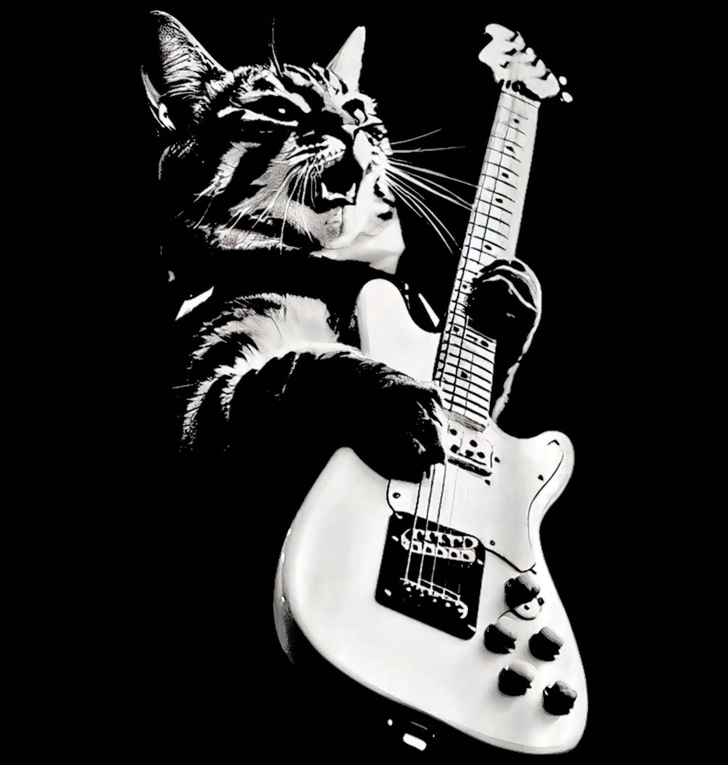 Dámské tričko Kočka s Kytarou. Syrová energie, ostré riffy a nespoutaný rock and roll – přesně to vystihuje tento originální motiv. Dominantou designu je dravá kočka, která s otevřenou tlamou a vášní sobě vlastní drtí elektrickou kytaru. Černobílé provedení dodává motivu kontrastní, koncertní atmosféru a podtrhuje divoký charakter celé kompozice.