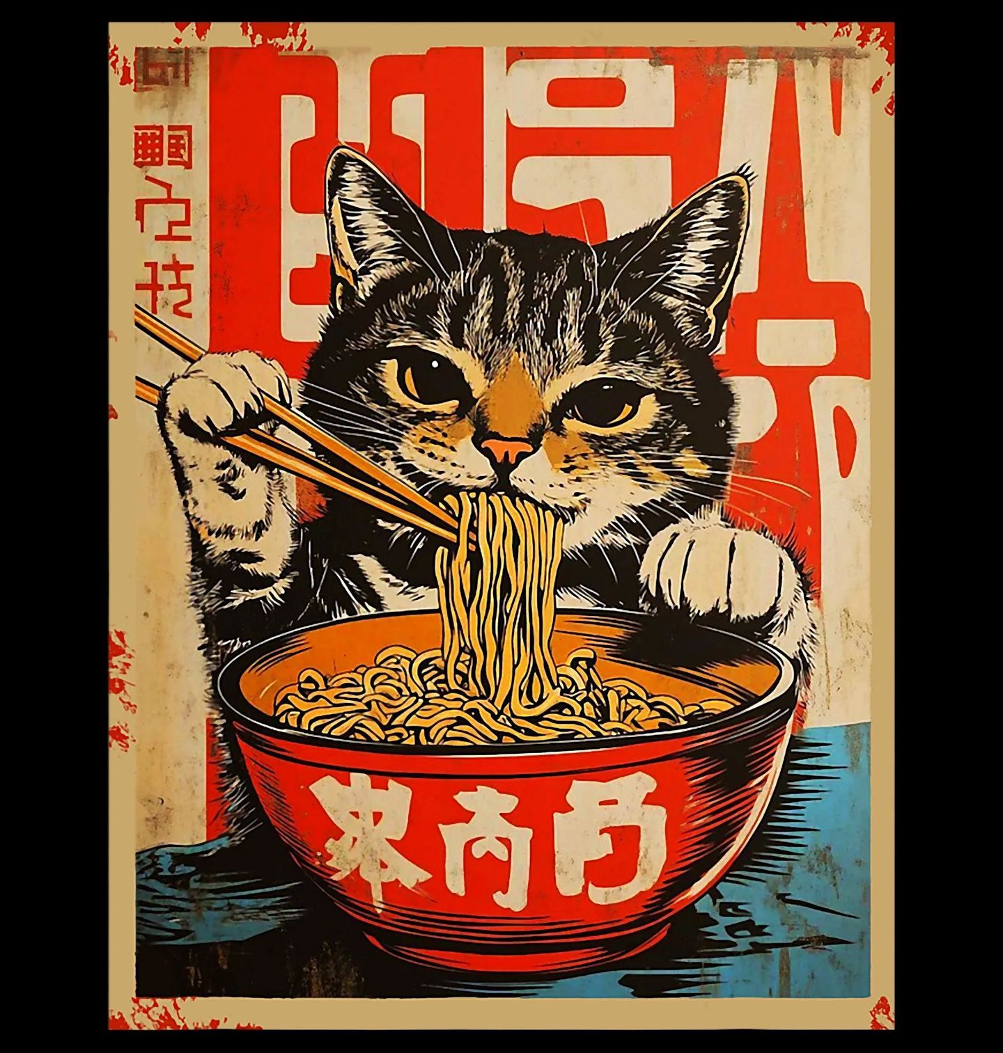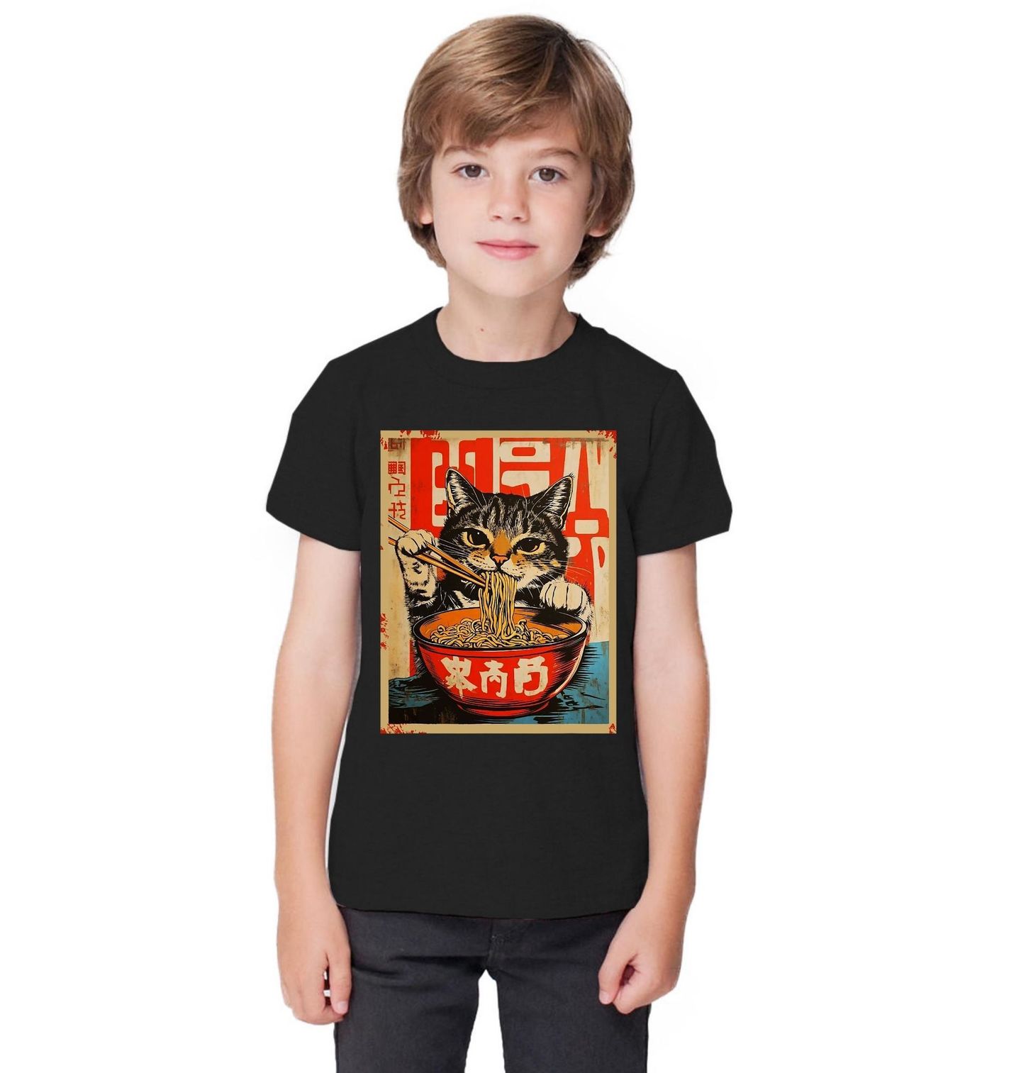 Dětské tričko Kočka s Miskou Nudlí. Hravě stylizovaná ilustrace připomíná retro japonské plakáty, kde kočka s vážným pohledem ovládá hůlky jako mistr a užívá si svou misku ramenu. Tento design je ideální pro každého, kdo miluje zvířata, Japonsko i netradičního umění.