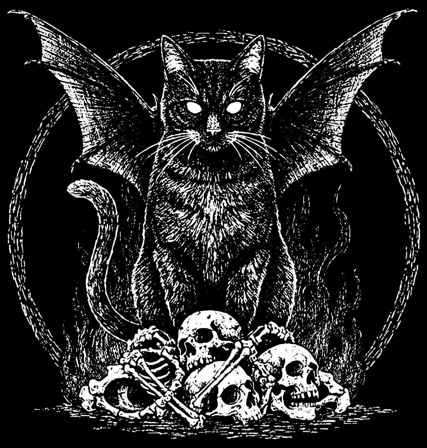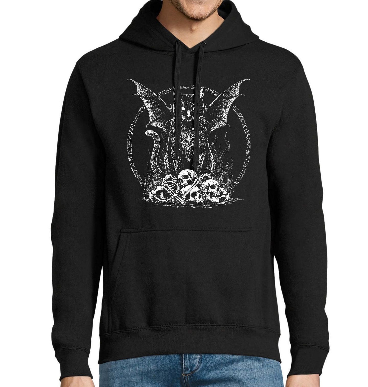 Pánská mikina Kočka s Netopýřími Křídly. Ilustrace zobrazuje démonickou postavu, kterou je kočka s roztaženými křídly, sedící na hromadě, kde každá lebka symbolizuje tajemství, smrt i sílu. Právě kombinace prvků jako lebka a horor vytváří unikátní design, který zaujme každého fanouška temné estetiky, metalové kultury nebo gotického stylu.