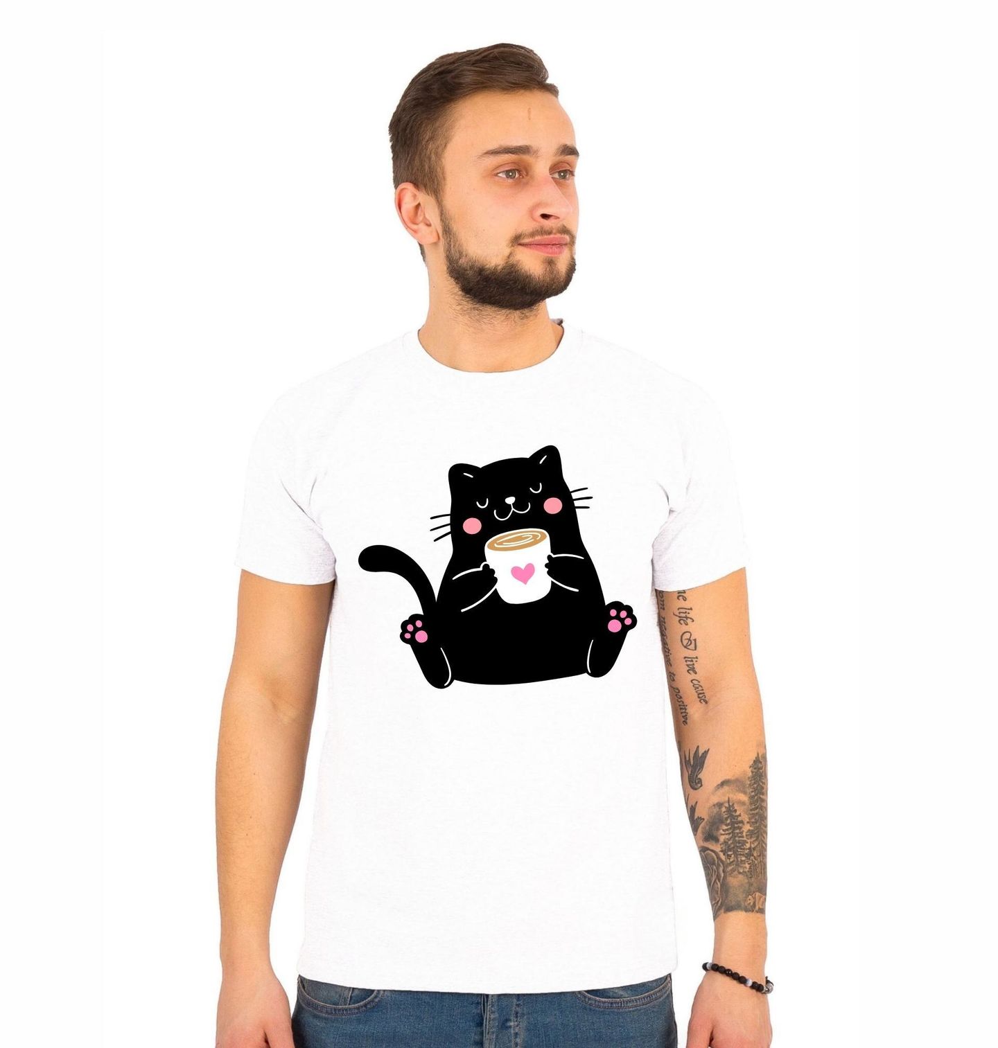 Pánské tričko Kočka s Šálkem v Packách. Roztomilá černá kočka, co drží šálek kávy a užívá si klidný moment. Tento motiv spojuje roztomilou kočku, kávu a klidnou atmosféru do dokonalé kombinace pro milovníky pohody a koček.