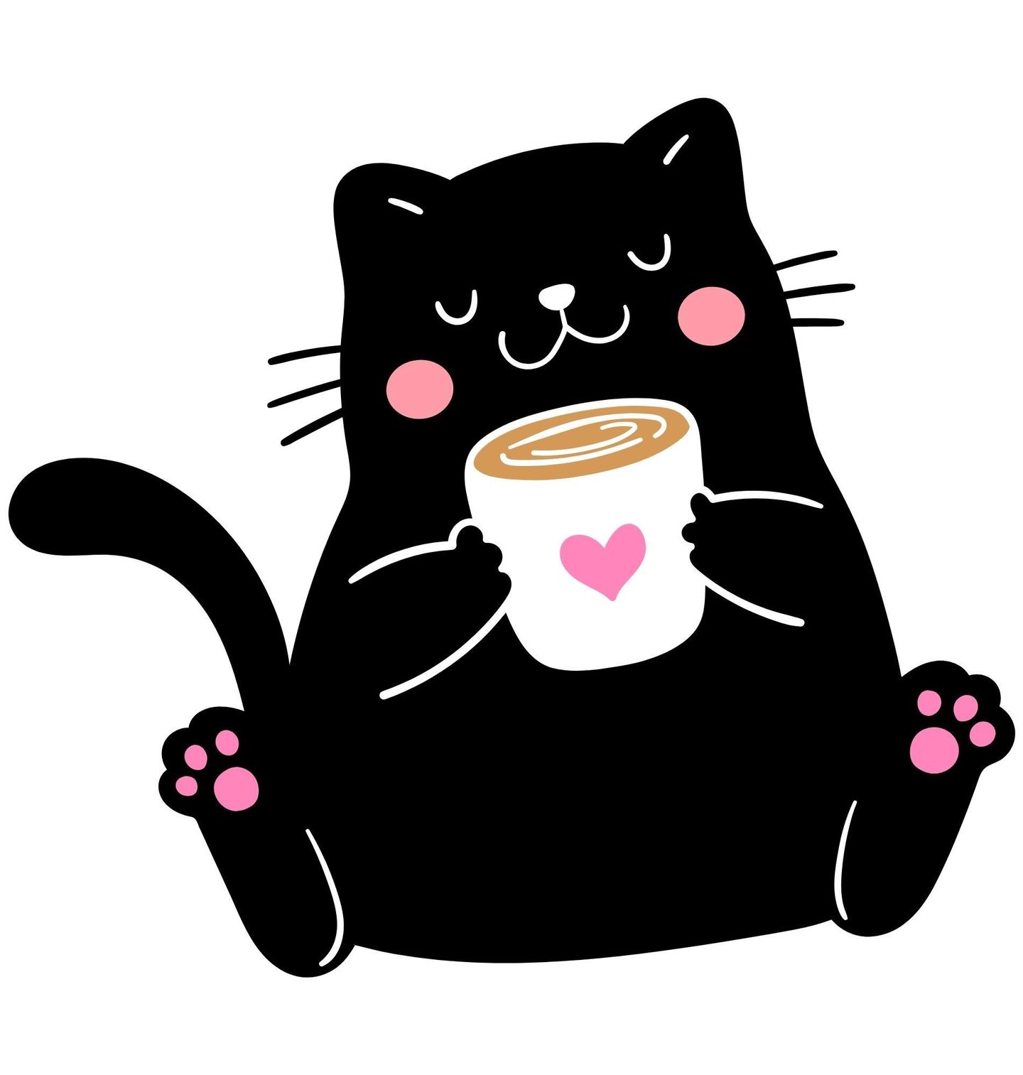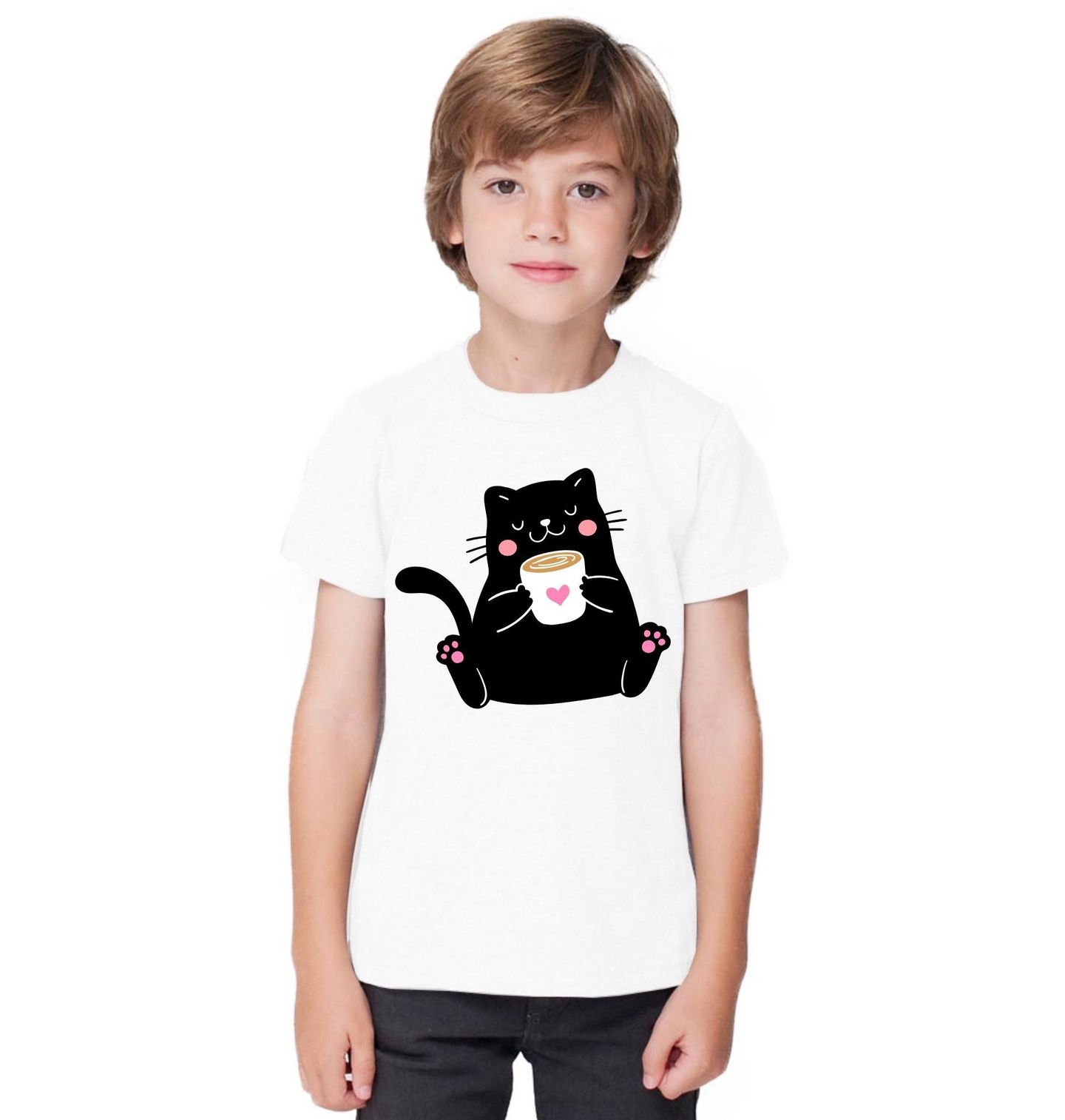 Dětské tričko Kočka s Šálkem v Packách. Roztomilá černá kočka, co drží šálek kávy a užívá si klidný moment. Tento motiv spojuje roztomilou kočku, kávu a klidnou atmosféru do dokonalé kombinace pro milovníky pohody a koček.