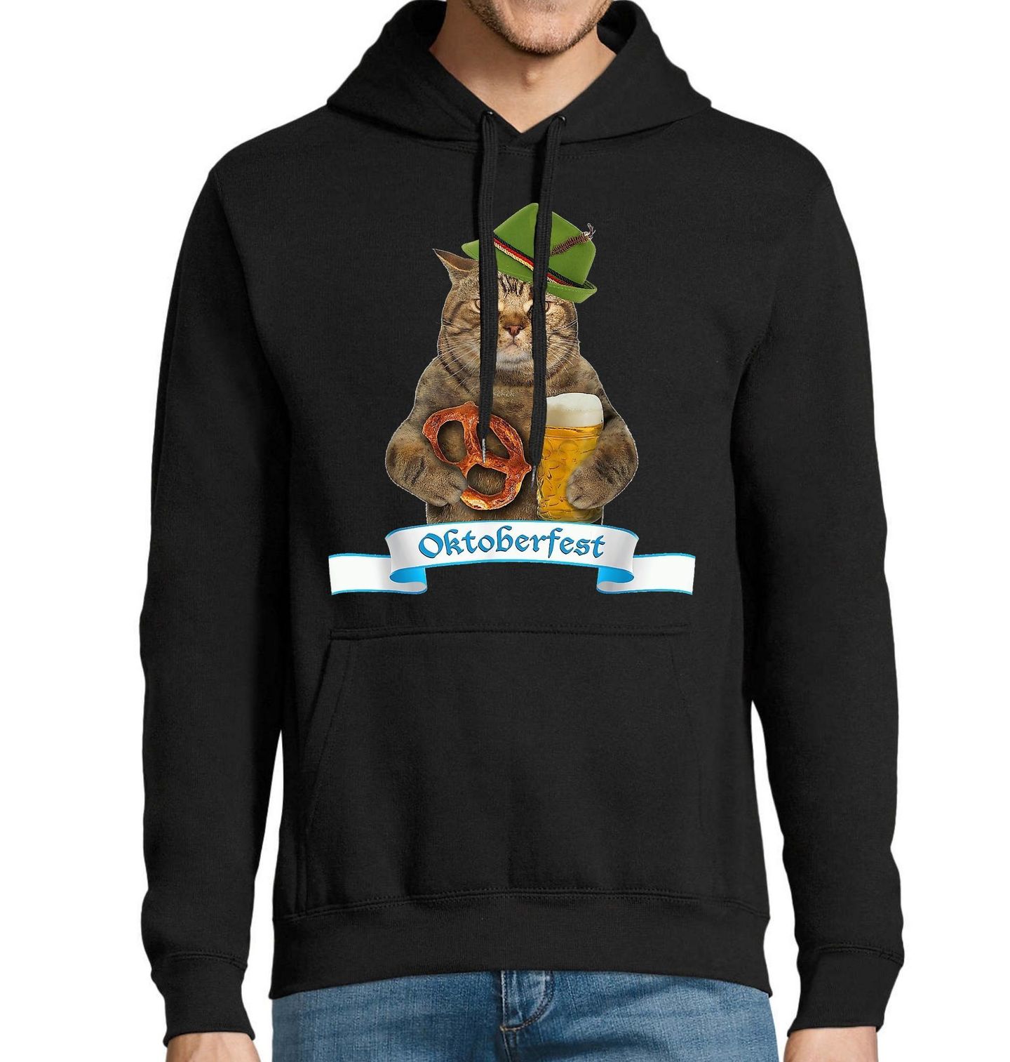 Pánská mikina Kočka Slaví Oktoberfest. Vtipný motiv zobrazuje kočku v tradičním bavorském klobouku, která drží půllitr piva a preclík, což jsou typické symboly festivalu Oktoberfest. Design spojuje humor, zvířecí motiv a bavorskou kulturu v originální a zábavnou ilustraci.