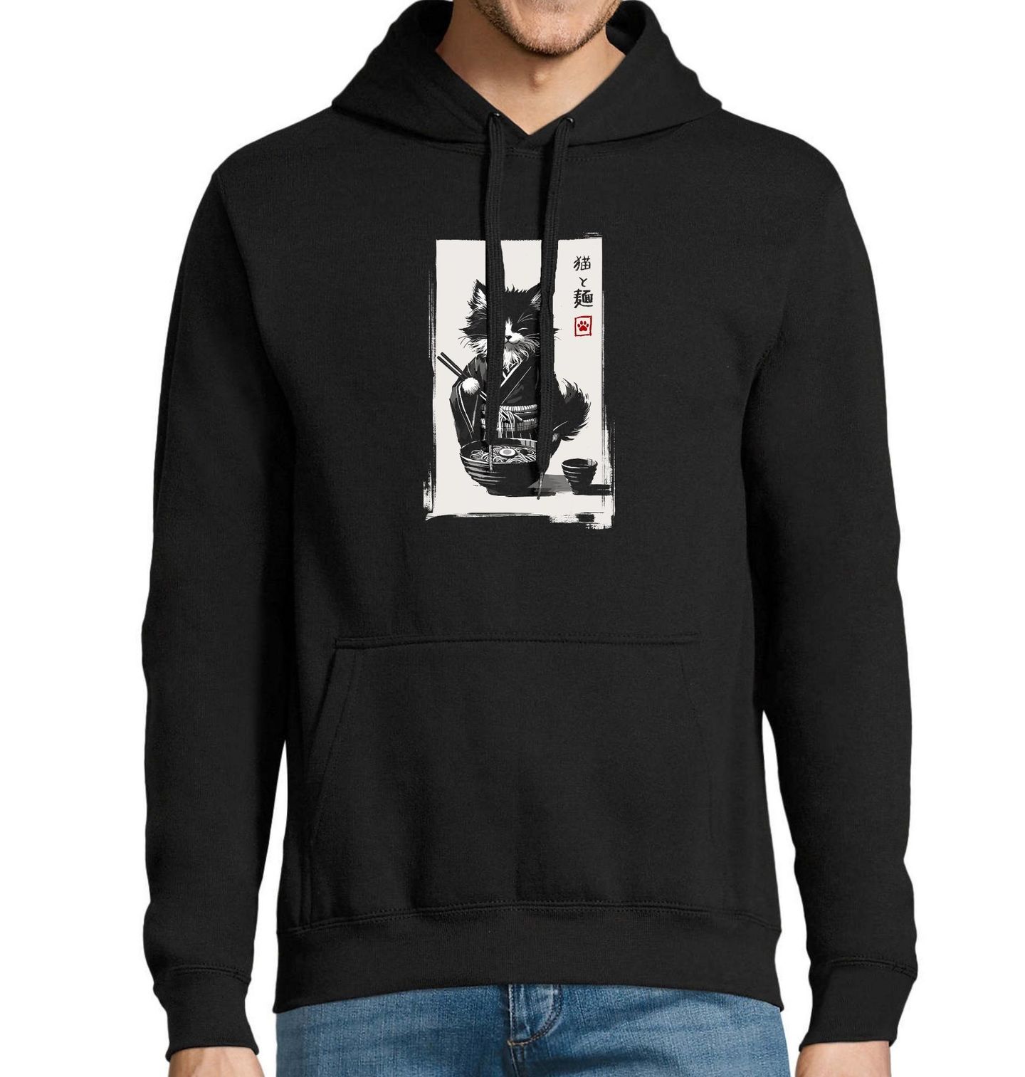 Pánská mikina Kočka v Kimonu s Miskou Ramenu. Originální motiv, na kterém je kočka oblečená v tradičním japonském kimonu, jak si vychutnává misku horkého ramen. Ilustrace je stylizovaná do japonského inkoustového umění. Na obrázku je také japonský nápis „猫と麺“, což v překladu znamená „kočka a nudle“. Motiv potěší každého, kdo miluje kočky, Japonsko i dobrý ramen.