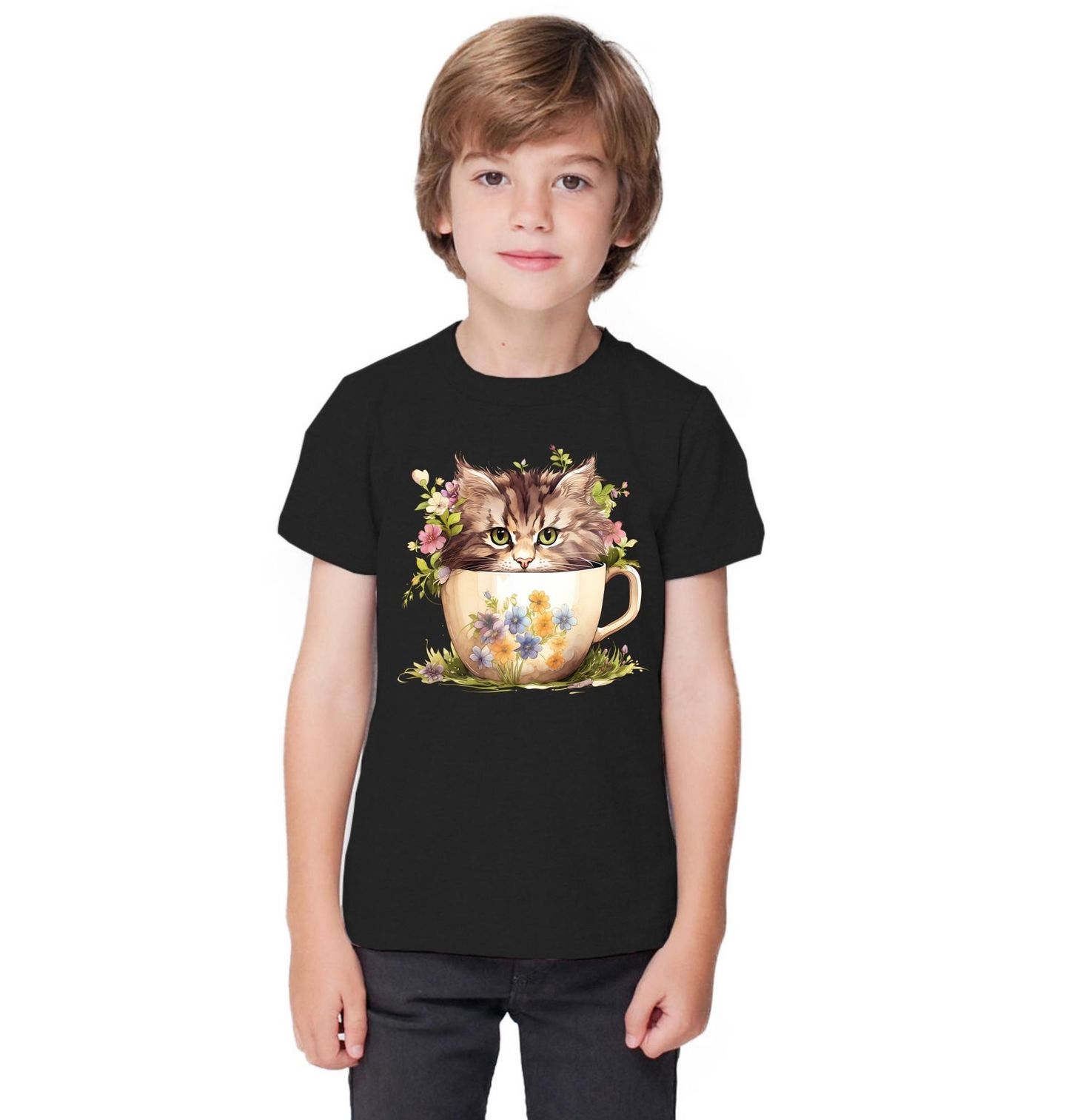 Dětské tričko Kočka v Květinovém Hrnku. Tahle okouzlující kočka vykukující z hrnek plného květiny je doslova jako živý obrázek z pohádky! Jemný design s romantickým nádechem a pastelovými barvami přinese do každého dne radost, klid a úsměv. Skvělý motiv pro všechny, kteří milují kočky, přírodu a něžnou estetiku.